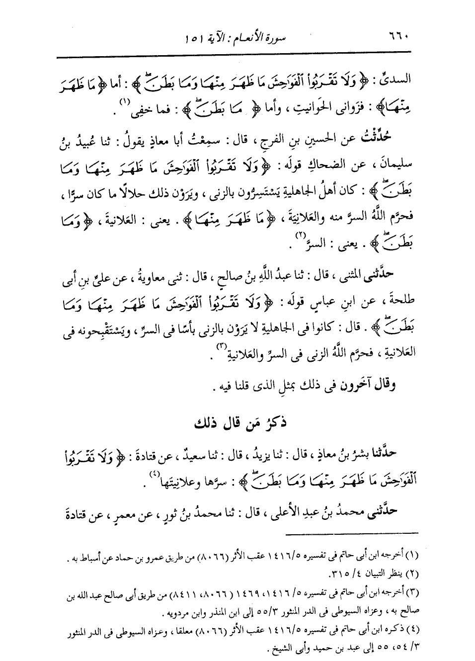 حَدَّثَنِي الْمُثَنَّى، قَالَ: ثنا عَبْدُ اللَّهِ بْنُ صَالِحٍ، قَالَ: ثني مُعَاوِيَةُ، عَنْ عَلِيِّ بْنِ أَبِي طَلْحَةَ، عَنِ ابْنِ عَبَّاسٍ، قَوْلُهُ: {وَلَا تَقْرَبُوا الْفَوَاحِشَ مَا ظَهَرَ مِنْهَا وَمَا بَطَنَ} [الأنعام: 151] ، قَالَ: «§كَانُوا فِي الْجَاهِلِيَّةِ لَا يَرَوْنَ بِالزِّنَا بَأْسًا فِي السِّرِّ، وَيَسْتَقْبِحُونَهُ فِي الْعَلَانِيَةِ، فَحَرَّمَ اللَّهُ الزِّنَا فِي السِّرِّ وَالْعَلَانِيَةِ» وَقَالَ آخَرُونَ فِي ذَلِكَ بِمِثْلِ الَّذِي قُلْنَا فِيهِ