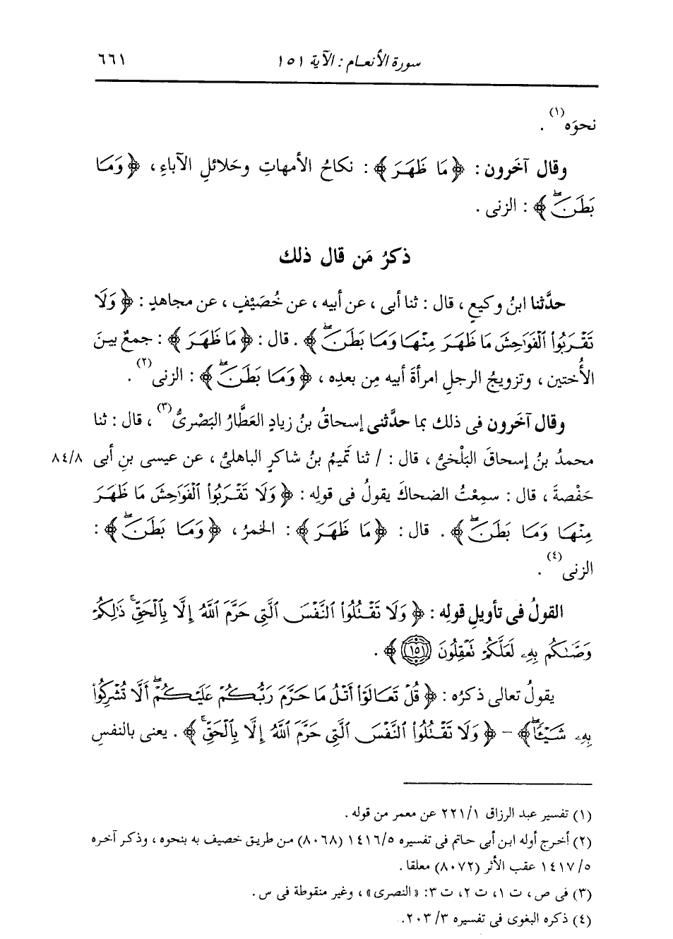 §الْقَوْلُ فِي تَأْوِيلِ قَوْلِهِ تَعَالَى: {وَلَا تَقْتُلُوا النَّفْسَ الَّتِي حَرَّمَ اللَّهُ إِلَّا بِالْحَقِّ ذَلِكُمْ وَصَّاكُمْ بِهِ لَعَلَّكُمْ تَعْقِلُونَ} [الأنعام: 151] يَقُولُ تَعَالَى ذِكْرُهُ: {قُلْ تَعَالَوْا أَتْلُ مَا حَرَّمَ رَبُّكُمْ عَلَيْكُمْ أَلَّا تُشْرِكُوا بِهِ شَيْئًا} [الأنعام: 151] ، {وَلَا تَقْتُلُوا النَّفْسَ الَّتِي حَرَّمَ اللَّهُ إِلَّا بِالْحَقِّ} [الأنعام: 151] ، يَعْنِي بِالنَّفْسِ