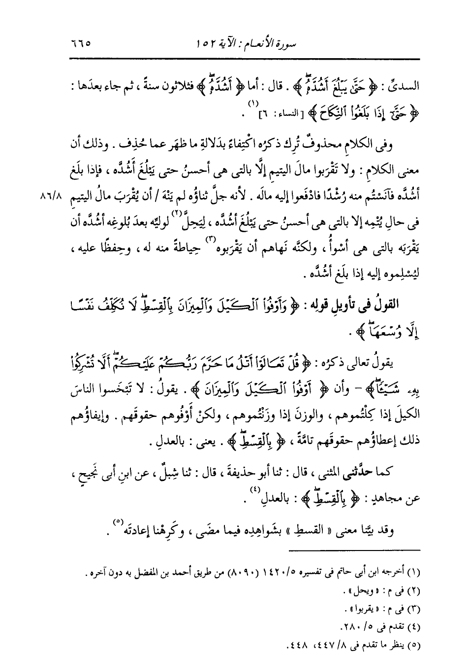 §الْقَوْلُ فِي تَأْوِيلِ قَوْلِهِ تَعَالَى: {وَأَوْفُوا الْكَيْلَ وَالْمِيزَانَ بِالْقِسْطِ لَا نُكَلِّفُ نَفْسًا إِلَّا وُسْعَهَا} [الأنعام: 152] يَقُولُ تَعَالَى ذِكْرُهُ: {قُلْ تَعَالَوْا أَتْلُ مَا حَرَّمَ رَبُّكُمْ عَلَيْكُمْ أَلَّا تُشْرِكُوا بِهِ شَيْئًا} [الأنعام: 151] وَأَنْ أَوْفُوا الْكَيْلَ وَالْمِيزَانَ، يَقُولُ: لَا تَبْخَسُوا النَّاسَ الْكَيْلَ إِذَا كِلْتُوهُمْ، وَالْوَزْنَ إِذَا وَزَنْتُمُوهُمْ، وَلَكِنْ أَوْفُوهُمْ حُقُوقَهُمْ، وَإِيفَاؤُهُمْ ذَلِكَ: إِعْطَاؤُهُمْ حُقُوقَهُمْ تَامَّةً بِالْقِسْطِ، يَعْنِي: بِالْعَدْلِ. كَمَا