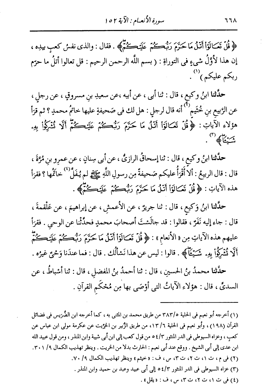حَدَّثَنَا مُحَمَّدُ بْنُ الْحُسَيْنِ، قَالَ: ثنا أَحْمَدُ بْنُ الْمُفَضَّلِ، قَالَ: ثنا أَسْبَاطٌ، عَنِ السُّدِّيِّ، قَالَ: «§هَؤُلَاءِ الْآيَاتُ الَّتِي أَوْصَى بِهَا مِنْ مُحْكَمِ الْقُرْآنِ»