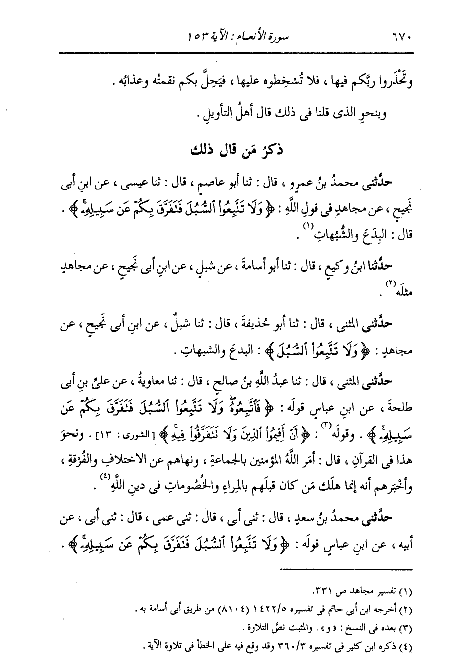ذِكْرُ مَنْ قَالَ ذَلِكَ حَدَّثَنِي مُحَمَّدُ بْنُ عَمْرٍو، قَالَ: ثنا أَبُو عَاصِمٍ، قَالَ: ثنا عِيسَى، عَنِ ابْنِ أَبِي نَجِيحٍ، عَنْ مُجَاهِدٍ، فِي قَوْلِ اللَّهِ: {§وَلَا تَتَّبِعُوا السُّبُلَ فَتَفَرَّقَ بِكُمْ عَنْ سَبِيلِهِ} [الأنعام: 153] ، قَالَ: «الْبِدَعُ وَالشُّبُهَاتُ» حَدَّثَنَا ابْنُ وَكِيعٍ قَالَ: ثنا أَبُو أُسَامَةَ، عَنْ شِبْلٍ، عَنِ ابْنِ أَبِي نَجِيحٍ، عَنْ مُجَاهِدٍ، مِثْلَهُ