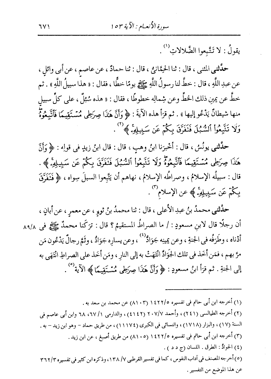 حَدَّثَنِي الْمُثَنَّى، قَالَ: ثنا الْحِمَّانِيُّ، قَالَ: ثنا حَمَّادٌ، عَنْ عَاصِمٍ، عَنْ أَبِي وَائِلٍ، عَنْ عَبْدِ اللَّهِ، قَالَ: خَطَّ لَنَا رَسُولُ اللَّهِ صَلَّى اللهُ عَلَيْهِ وَسَلَّمَ يَوْمًا خَطًّا فَقَالَ: «هَذَا سَبِيلُ اللَّهِ» ، ثُمَّ خَطَّ عَنْ يَمِينِ ذَلِكَ الْخَطِّ وَعَنْ شِمَالِهِ خُطُوطًا فَقَالَ: «§هَذِهِ سُبُلٌ عَلَى كُلِّ سَبِيلٍ مِنْهَا شَيْطَانٌ يَدْعُو إِلَيْهَا» ، ثُمَّ قَرَأَ هَذِهِ الْآيَةَ: {وَأَنَّ هَذَا صِرَاطِي مُسْتَقِيمًا فَاتَّبِعُوهُ وَلَا تَتَّبِعُوا السُّبُلَ} [الأنعام: 153] فَتَفَرَّقَ بِكُمْ عَنْ سَبِيلِهِ