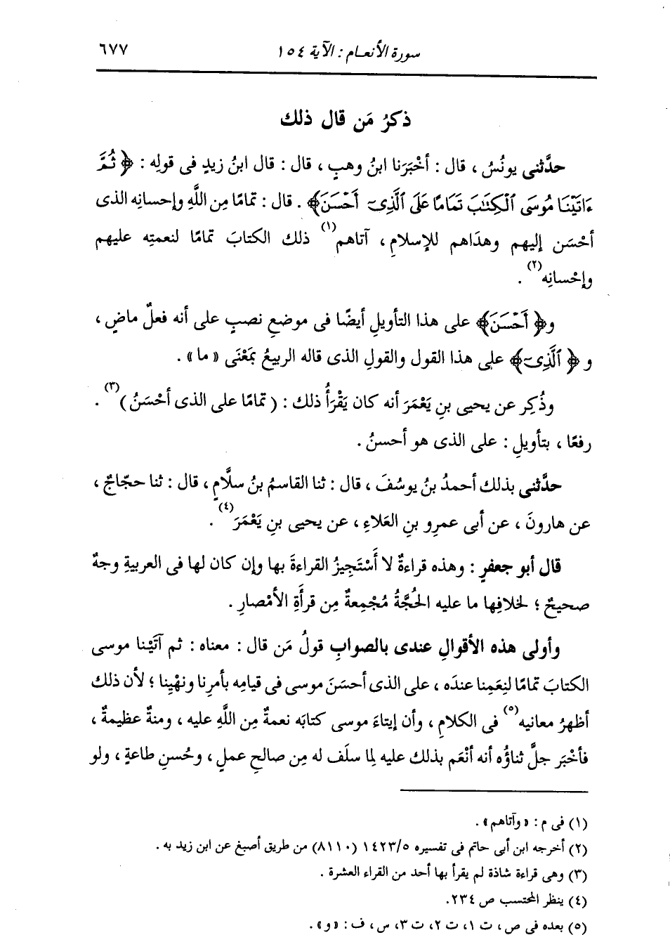 ذِكْرُ مَنْ قَالَ ذَلِكَ حَدَّثَنِي يُونُسُ، قَالَ: أَخْبَرَنَا ابْنُ وَهْبٍ، قَالَ: قَالَ ابْنُ زَيْدٍ، فِي قَوْلِهِ: {ثُمَّ آتَيْنَا مُوسَى الْكِتَابَ تَمَامًا عَلَى الَّذِي أَحْسَنَ} [الأنعام: 154] قَالَ: «§تَمَامًا مِنَ اللَّهِ وَإِحْسَانِهِ الَّذِي أَحْسَنَ إِلَيْهِمْ وَهَدَاهُمْ لِلْإِسْلَامِ، وَآتَاهُمْ ذَلِكَ الْكِتَابَ تَمَامًا لِنِعْمَتِهِ عَلَيْهِ وَإِحْسَانِهِ» (وَ {أَحْسَنَ} [الأنعام: 154] ) عَلَى هَذَا التَّأْوِيلِ أَيْضًا فِي مَوْضِعِ نَصْبٍ عَلَى أَنَّهُ فِعْلٌ مَاضٍ. (وَالَّذِي) عَلَى هَذَا الْقَوْلِ وَالْقَوْلِ الَّذِي قَالَهُ الرَّبِيعُ بِمَعْنَى: (مَا)