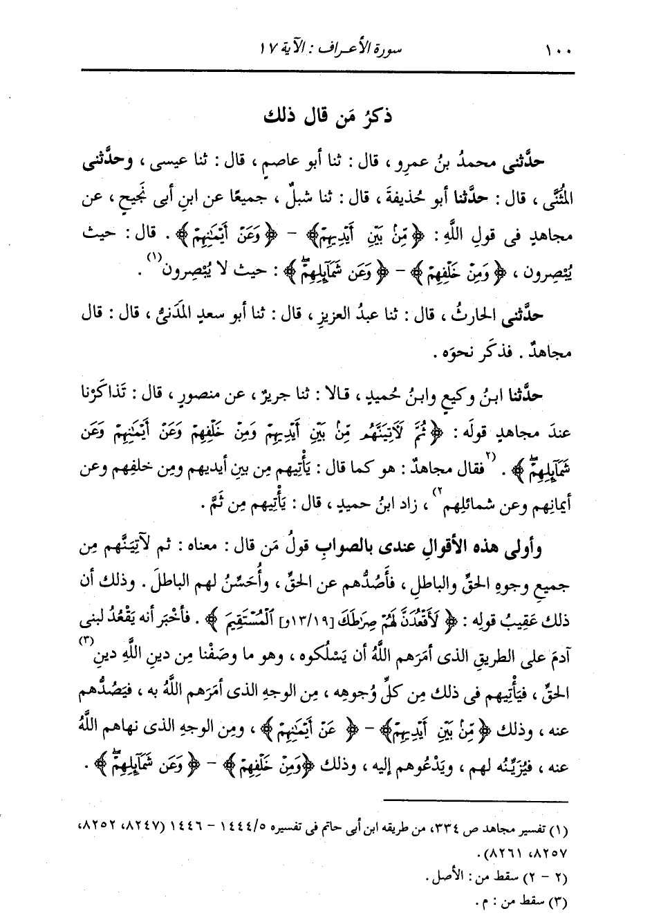 ذِكْرُ مَنْ قَالَ ذَلِكَ حَدَّثَنِي مُحَمَّدُ بْنُ عَمْرٍو، قَالَ: ثنا أَبُو عَاصِمٍ، قَالَ: ثنا عِيسَى، عَنِ ابْنِ أَبِي نَجِيحٍ، عَنْ مُجَاهِدٍ، قَوْلُ اللَّهِ: {§مِنْ بَيْنِ أَيْدِيهِمْ} [الأعراف: 17] , {وَعَنْ أَيْمَانِهِمْ} [الأعراف: 17] قَالَ: «حَيْثُ يُبْصِرُونَ» ، {وَمِنْ خَلْفِهِمْ} [الأعراف: 17] ، {وَعَنْ شَمَائِلِهِمْ} [الأعراف: 17] : «حَيْثُ لَا يُبْصِرُونَ» حَدَّثَنِي الْمُثَنَّى قَالَ: ثنا أَبُو حُذَيْفَةَ قَالَ: ثنا شِبْلٌ، عَنِ ابْنِ أَبِي نَجِيحٍ، عَنْ مُجَاهِدٍ، مِثْلَهُ