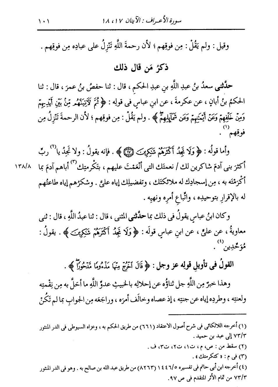 ذِكْرُ مَنْ قَالَ ذَلِكَ حَدَّثَنَا سَعْدُ بْنُ عَبْدِ اللَّهِ بْنِ عَبْدِ الْحَكَمِ الْمِصْرِيُّ، قَالَ: ثنا حَفْصُ بْنُ عُمَرَ، قَالَ: ثنا الْحَكَمُ بْنُ أَبَانَ، عَنْ عِكْرِمَةَ، عَنِ ابْنِ عَبَّاسٍ، فِي قَوْلِهِ: {§ثُمَّ لَآتِيَنَّهُمْ مِنْ بَيْنِ أَيْدِيهِمْ وَمِنْ خَلْفِهِمْ وَعَنْ أَيْمَانِهِمْ وَعَنْ شَمَائِلِهِمْ} [الأعراف: 17] وَلَمْ يَقُلْ: (مِنْ فَوْقِهِمْ) ، لِأَنَّ الرَّحْمَةَ تَنْزِلُ مِنْ فَوْقِهِمْ