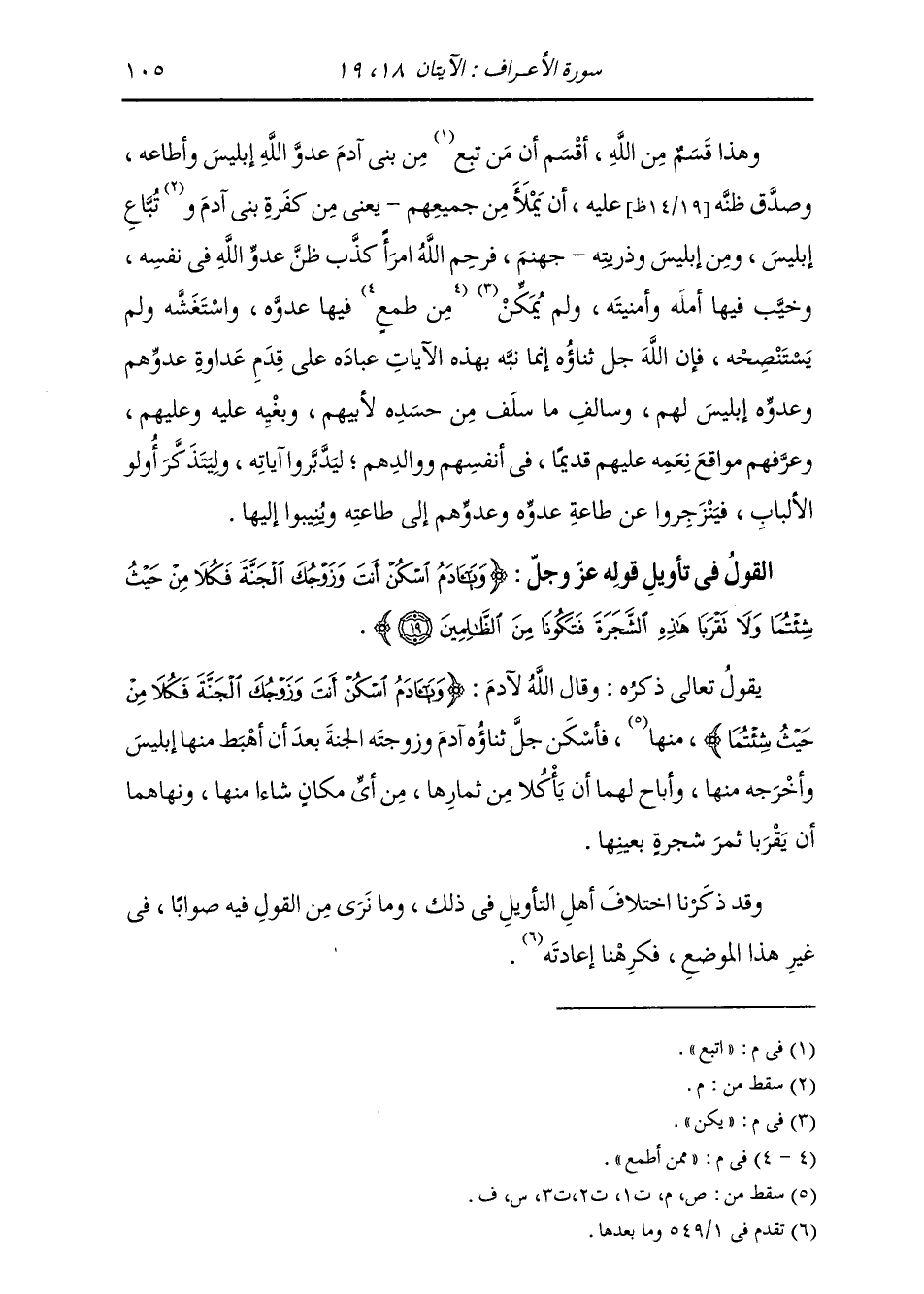 §الْقَوْلُ فِي تَأْوِيلِ قَوْلِهِ تَعَالَى: {وَيَا آدَمُ اسْكُنْ أَنْتَ وَزَوْجُكَ الْجَنَّةَ فَكُلَا مِنْ حَيْثِ شِئْتُمَا وَلَا تَقْرَبَا هَذِهِ الشَّجَرَةَ فَتَكُونَا مِنَ الظَّالِمِينَ} [الأعراف: 19] يَقُولُ اللَّهُ تَعَالَى ذِكْرُهُ: وَقَالَ اللَّهُ لِآدَمَ: {يَا آدَمُ اسْكُنْ أَنْتَ وَزَوْجُكَ الْجَنَّةَ فَكُلَا مِنْ حَيْثُ شِئْتُمَا} [الأعراف: 19] : فَأَسْكَنَ جَلَّ ثَنَاؤُهُ آدَمَ وَزَوْجَتَهُ الْجَنَّةَ بَعْدَ أَنْ أُهْبِطَ مِنْهَا إِبْلِيسُ وَأَخْرَجَهُ مِنْهَا، وَأَبَاحَ لَهُمَا أَنْ يَأْكُلَا مِنْ ثِمَارِهَا مِنْ أَيِّ مَكَانٍ شَاءَا مِنْهَا، وَنَهَاهُمَا أَنْ يَقْرَبَا ثَمَرَ شَجَرَةٍ بِعَيْنِهَا. وَقَدْ ذَكَرْنَا اخْتِلَافَ أَهْلِ التَّأْوِيلِ فِي ذَلِكَ، وَمَا نَرَى مِنَ الْقَوْلِ فِيهِ صَوَابًا فِي غَيْرِ هَذَا الْمَوْضِعِ، فَكَرِهْنَا إِعَادَتَهُ -[106]-. {فَتَكُونَا مِنَ الظَّالِمِينَ} [البقرة: 35] يَقُولُ: فَتَكُونَا مِمَّنْ خَالَفَ أَمْرَ رَبِّهِ، وَفَعَلَ مَا لَيْسَ لَهُ فِعْلُهُ