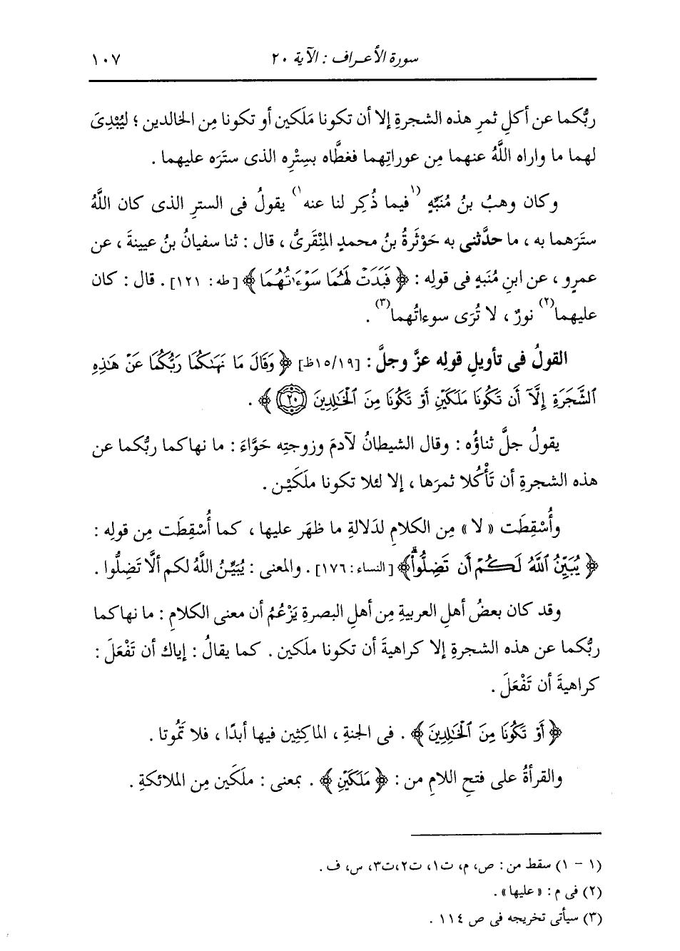 §الْقَوْلُ فِي تَأْوِيلِ قَوْلِهِ تَعَالَى: {وَقَالَ مَا نَهَاكُمَا رَبُّكُمَا عَنْ هَذِهِ الشَّجَرَةِ إِلَّا أَنْ تَكُونَا مَلَكَيْنِ أَوْ تَكُونَا مِنَ الْخَالِدِينَ} [الأعراف: 20] يَقُولُ جَلَّ ثَنَاؤُهُ: وَقَالَ الشَّيْطَانُ لِآدَمَ وَزَوْجَتِهِ حَوَّاءَ: مَا نَهَاكُمَا رَبُّكُمَا عَنْ هَذِهِ الشَّجَرَةِ أَنْ تَأْكُلَا ثَمَرَهَا إِلَّا لِئَلَّا تَكُونَا مَلَكَيْنِ. وَأُسْقِطَتْ (لَا) مِنَ الْكَلَامِ لِدَلَالَةِ مَا ظَهَرَ عَلَيْهَا، كَمَا أُسْقِطَتْ مِنْ قَوْلِهِ: {يُبَيِّنُ اللَّهُ لَكُمْ أَنْ تَضِلُّوا} [النساء: 176] ، وَالْمَعْنَى: يُبَيِّنُ اللَّهُ لَكُمْ أَنْ لَا تَضِلُّوا. وَكَانَ بَعْضُ أَهْلِ الْعَرَبِيَّةِ مِنْ أَهْلِ الْبَصْرَةِ يَزْعُمُ أَنَّ مَعْنَى الْكَلَامِ: مَا نَهَاكُمَا رَبُّكُمَا عَنْ هَذِهِ الشَّجَرَةِ إِلَّا كَرَاهَةَ أَنْ تَكُونَا مَلَكَيْنِ، كَمَا يُقَالُ: إِيَّاكَ أَنْ تَفْعَلَ كَرَاهِيَةَ أَنْ تَفْعَلَ، أَوْ تَكُونَا مِنَ الْخَالِدِينَ فِي الْجَنَّةِ الْمَاكِثِينَ فِيهَا أَبَدًا فَلَا تَمُوتَا. وَالْقِرَاءَةُ عَلَى فَتْحِ اللَّامِ بِمَعْنَى مَلَكَيْنِ مِنَ الْمَلَائِكَةِ. -[108]- وَرُوِيَ عَنِ ابْنِ عَبَّاسٍ