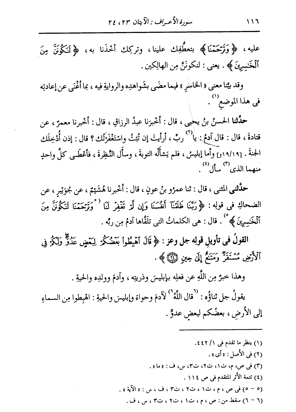 حَدَّثَنِي الْمُثَنَّى، قَالَ: ثنا عَمْرُو بْنُ عَوْنٍ، قَالَ: أَخْبَرَنَا هُشَيْمٌ، عَنْ جُوَيْبِرٍ، عَنِ الضَّحَّاكِ، فِي قَوْلِهِ: {§رَبَّنَا ظَلَمْنَا أَنْفُسَنَا وَإِنْ لَمْ تَغْفِرْ لَنَا} [الأعراف: 23] الْآيَةَ، قَالَ: «هِيَ الْكَلِمَاتُ الَّتِي تَلَقَّاهَا آدَمُ مِنْ رَبِّهِ»