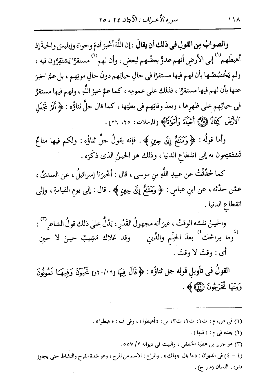كَمَا حُدِّثْتُ عَنْ عُبَيْدِ اللَّهِ بْنِ مُوسَى، قَالَ: أَخْبَرَنَا إِسْرَائِيلُ، عَنِ السُّدِّيِّ، عَمَّنْ حَدَّثَهُ عَنِ ابْنِ عَبَّاسٍ: {§وَمَتَاعٌ إِلَى حِينٍ} [الأعراف: 24] قَالَ: «إِلَى يَوْمِ الْقِيَامَةِ وَإِلَى انْقِطَاعِ الدُّنْيَا» وَالْحِينُ نَفْسُهُ الْوَقْتُ، غَيْرَ أَنَّهُ مَجْهُولُ الْقَدْرِ، يَدُلُّ عَلَى ذَلِكَ قَوْلُ الشَّاعِرِ: