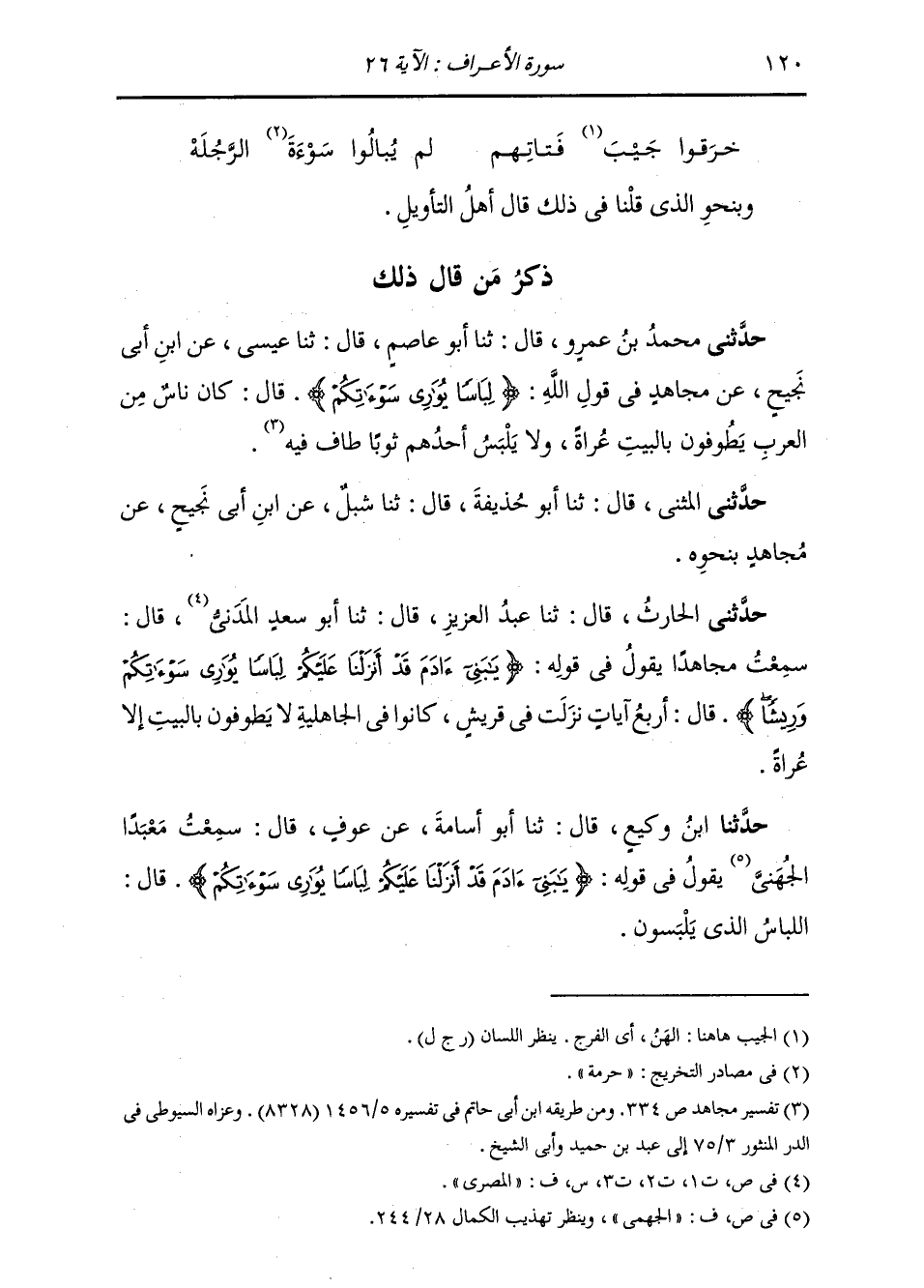 ذِكْرُ مَنْ قَالَ ذَلِكَ حَدَّثَنِي مُحَمَّدُ بْنُ عَمْرٍو، قَالَ: ثنا أَبُو عَاصِمٍ، قَالَ: ثنا عِيسَى، عَنِ ابْنِ أَبِي نَجِيحٍ، عَنْ مُجَاهِدٍ، فِي قَوْلِ اللَّهِ: {لِبَاسًا يُوَارِي سَوْآتِكُمْ} قَالَ: «§كَانَ نَاسٌ مِنَ الْعَرَبِ يَطُوفُونَ بِالْبَيْتِ عُرَاةً، وَلَا يَلْبَسُ أَحَدُهُمْ ثَوْبًا طَافَ فِيهِ» حَدَّثَنِي الْمُثَنَّى قَالَ: ثنا أَبُو حُذَيْفَةَ قَالَ: ثنا شِبْلٌ، عَنِ ابْنِ أَبِي نَجِيحٍ، عَنْ مُجَاهِدٍ، بِنَحْوِهِ