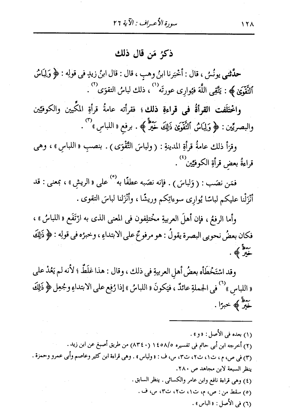 ذِكْرُ مَنْ قَالَ ذَلِكَ حَدَّثَنِي يُونُسُ، قَالَ: أَخْبَرَنَا ابْنُ وَهْبٍ، قَالَ: قَالَ ابْنُ زَيْدٍ، فِي قَوْلِهِ: {وَلِبَاسُ التَّقْوَى} [الأعراف: 26] : «§يَتَّقِي اللَّهُ فَيُوَارِي عَوْرَتَهُ، ذَلِكَ لِبَاسُ التَّقْوَى» وَاخْتَلَفَ الْقُرَّاءُ فِي قِرَاءَةِ ذَلِكَ، فَقَرَأَتْهُ عَامَّةُ قُرَّاءِ الْمَكِّيِّينَ وَالْكُوفِيِّينَ وَالْبَصْرِيِّينَ: {وَلِبَاسُ التَّقْوَى ذَلِكَ خَيْرٌ} [الأعراف: 26] بِرَفْعِ (وَلِبَاسُ) . وَقَرَأَ ذَلِكَ عَامَّةُ قُرَّاءِ الْمَدِينَةِ: (وَلِبَاسَ التَّقْوَى) بِنَصْبِ اللِّبَاسِ، وَهِيَ قِرَاءَةُ بَعْضِ قُرَّاءِ الْكُوفِيِّينَ. فَمَنْ نَصَبَ: (وَلِبَاسَ) فَإِنَّهُ نَصَبَهُ عَطْفًا عَلَى (الرِّيشِ) بِمَعْنَى: قَدْ أَنْزَلْنَا عَلَيْكُمْ لِبَاسًا يُوَارِي سَوْآتِكُمْ وَرِيشًا، وَأَنْزَلْنَا لِبَاسَ التَّقْوَى. وَأَمَّا الرَّفْعُ، فَإِنَّ أَهْلَ الْعَرَبِيَّةِ مُخْتَلِفُونَ فِي الْمَعْنَى الَّذِي ارْتَفَعَ بِهِ اللِّبَاسُ، فَكَانَ بَعْضُ نَحْوِيِّي الْبَصْرَةِ يَقُولُ: هُوَ مَرْفُوعٌ عَلَى الِابْتِدَاءِ، وَخَبَرُهُ فِي قَوْلِهِ: {ذَلِكَ خَيْرٌ} [الأعراف: 26] ، وَقَدِ اسْتَخْطَأَهُ بَعْضُ أَهْلِ الْعَرَبِيَّةِ فِي ذَلِكَ وَقَالَ: هَذَا غَلَطٌ، لِأَنَّهُ لَمْ يَعُدْ عَلَى اللِّبَاسِ فِي الْجُمْلَةِ عَائِدٌ، فَيَكُونُ اللِّبَاسُ إِذًا رُفِعَ عَلَى الِابْتِدَاءِ، وَجُعِلَ (ذَلِكَ خَيْرٌ) خَبَرًا. -[129]- وَقَالَ بَعْضُ نَحْوِيِّي الْكُوفَةِ: {وَلِبَاسُ} [الأعراف: 26] يُرْفَعُ بِقَوْلِهِ: (وَلِبَاسُ التَّقْوَى خَيْرٌ) ، وَيُجْعَلُ ذَلِكَ مِنْ نَعْتِهِ. بِـ (خَيْرٌ) لَمْ يَكُنْ فِي ذَلِكَ وَجْهٌ إِلَّا أَنْ يُجْعَلَ اللِّبَاسُ نَعْتًا، لَا أَنَّهُ عَائِدٌ عَلَى اللِّبَاسِ مِنْ ذِكْرِهِ فِي قَوْلِهِ: {ذَلِكَ خَيْرٌ} [الأعراف: 26] ، فَيَكُونُ (خَيْرٌ) مَرْفُوعًا بِذَلِكَ وَذَلِكَ بِهِ. فَإِذْ كَانَ ذَلِكَ كَذَلِكَ، فَتَأْوِيلُ الْكَلَامِ إِذَنْ: رَفَعَ لِبَاسَ التَّقْوَى، وَلِبَاسُ التَّقْوَى ذَلِكَ الَّذِي قَدْ عَلِمْتُمُوهُ خَيْرٌ لَكُمْ يَا بَنِي آدَمَ مِنْ لِبَاسِ الثِّيَابِ الَّتِي تُوَارِي سَوْآتِكُمْ، وَمِنَ الرِّيَاشِ الَّتِي أَنْزَلْنَاهَا إِلَيْكُمْ فَالْبَسُوهُ. وَأَمَّا تَأْوِيلُ مَنْ قَرَأَهُ نَصْبًا، فَإِنَّهُ: يَا بَنِي آدَمَ، قَدْ أَنْزَلْنَا عَلَيْكُمْ لِبَاسًا يُوَارِي سَوْآتِكُمْ، وَرِيشًا، وَلِبَاسُ التَّقْوَى هَذَا الَّذِي أَنْزَلْنَا عَلَيْكُمْ، مِنَ اللِّبَاسِ الَّذِي يُوَارِي سَوْآتِكُمْ وَالرِّيشِ، وَلِبَاسُ التَّقْوَى خَيْرٌ لَكُمْ مِنَ التَّعَرِّي وَالتَّجَرُّدِ مِنَ الثِّيَابِ فِي طَوَافِكُمْ بِالْبَيْتِ، فَاتَّقُوا اللَّهَ وَالْبَسُوا مَا رَزَقَكُمُ اللَّهُ مِنَ الرِّيَاشِ، وَلَا تُطِيعُوا الشَّيْطَانَ بِالتَّجَرُّدِ وَالتَّعَرِّي مِنَ الثِّيَابِ، فَإِنَّ ذَلِكَ سُخْرِيَةٌ مِنْهُ بِكُمْ وَخُدْعَةٌ، كَمَا فَعَلَ بِأَبَوَيْكُمْ آدَمَ وَحَوَّاءَ فَخَدَعَهُمَا حَتَّى جَرَّدَهُمَا مِنْ لِبَاسِ اللَّهِ الَّذِي كَانَ أَلْبَسَهُمَا بِطَاعَتِهِمَا لَهُ فِي أَكْلِ مَا كَانَ اللَّهُ نَهَاهُمَا عَنْ أَكْلِهِ مِنْ ثَمَرِ الشَّجَرَةِ الَّتِي عَصَيَاهُ بِأَكْلِهَا. -[130]- وَهَذِهِ الْقِرَاءَةُ أَوْلَى الْقِرَاءَتَيْنِ فِي ذَلِكَ عِنْدِي بِالصَّوَابِ، أَعْنِي نَصْبَ قَوْلِهِ: (وَلِبَاسَ التَّقْوَى) لِصِحَّةِ مَعْنَاهُ فِي التَّأْوِيلِ عَلَى مَا بَيَّنْتُ، وَأَنَّ اللَّهَ إِنَّمَا ابْتَدَأَ الْخَبَرَ عَنْ إِنْزَالِهِ اللِّبَاسَ الَّذِي يُوَارِي سَوْآتِنَا وَالرِّيَاشِ تَوْبِيخًا لِلْمُشْرِكِينَ الَّذِينَ كَانُوا يَتَجَرَّدُونَ فِي حَالِ طَوَافِهِمْ بِالْبَيْتِ، وَيَأْمُرُهُمْ بِأَخْذِ ثِيَابِهِمْ وَالِاسْتِتَارِ بِهَا فِي كُلِّ حَ