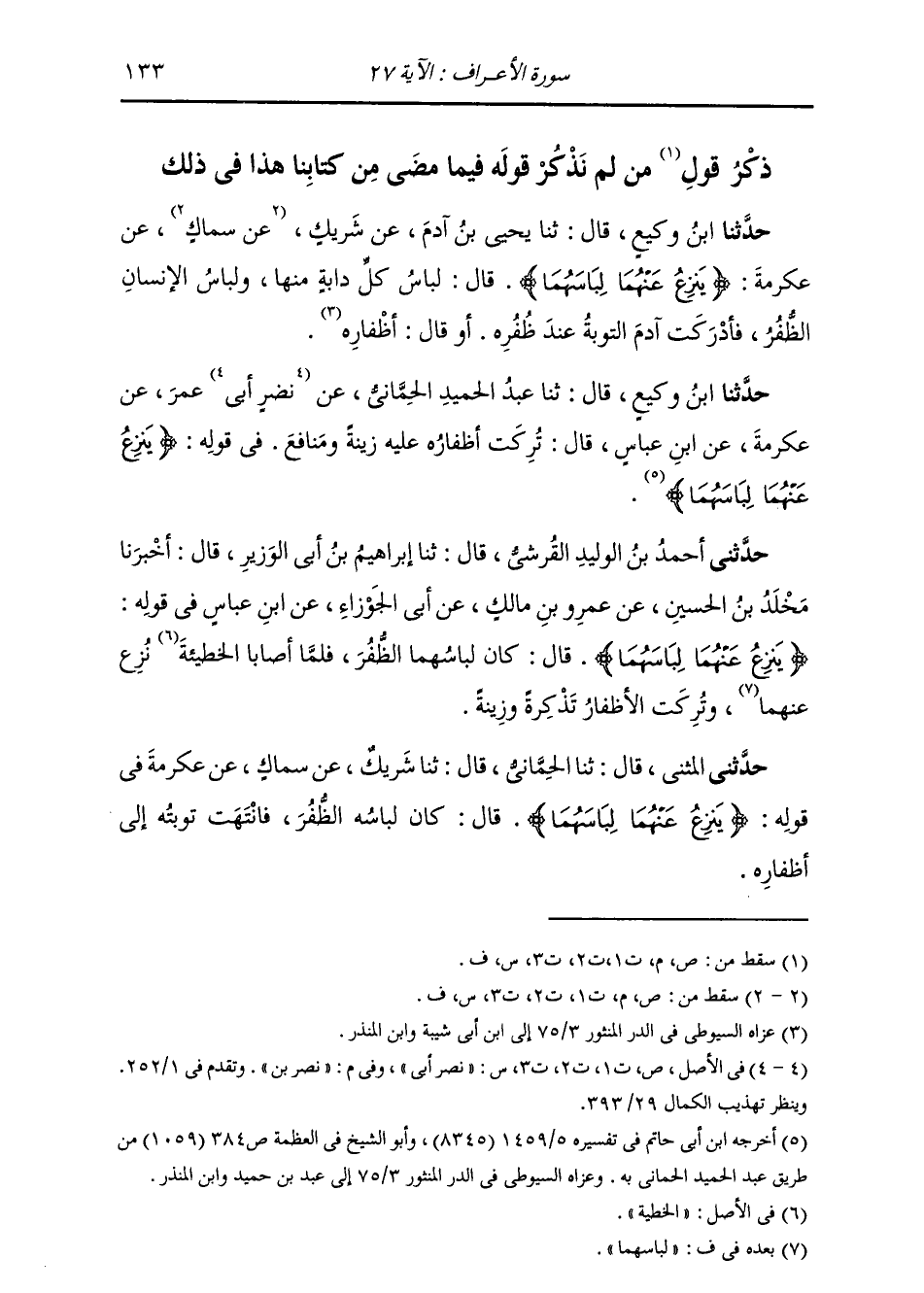 حَدَّثَنَا ابْنُ وَكِيعٍ، قَالَ: ثنا عَبْدُ الْحَمِيدِ الْحِمَّانِيُّ، عَنْ نَصْرِ بْنِ عُمَرَ، عَنْ عِكْرِمَةَ، عَنِ ابْنِ عَبَّاسٍ، قَالَ: " §تُرِكَتْ أَظْفَارُهُ عَلَيْهِ زِينَةً وَمَنَافِعَ فِي قَوْلِهِ: {يَنْزِعُ عَنْهُمَا لِبَاسَهُمَا} [الأعراف: 27]