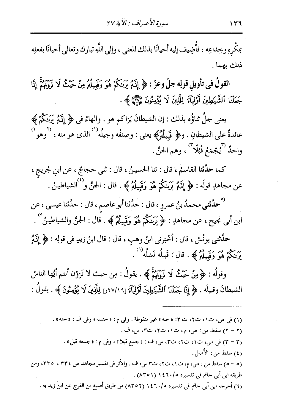 كَمَا حَدَّثَنَا الْقَاسِمُ، قَالَ: ثنا الْحُسَيْنُ، قَالَ: ثني حَجَّاجٌ، عَنِ ابْنِ جُرَيْجٍ، عَنْ مُجَاهِدٍ، قَوْلُهُ: {§إِنَّهُ يَرَاكُمْ هُوَ وَقَبِيلُهُ} [الأعراف: 27] قَالَ: «الْجِنُّ وَالشَّيَاطِينُ»