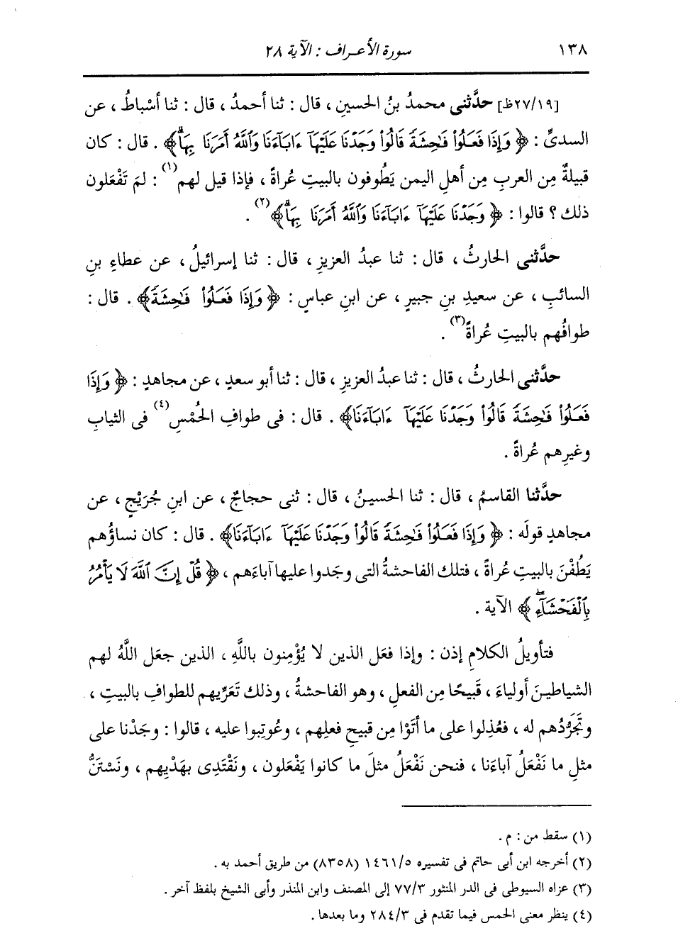 حَدَّثَنِي مُحَمَّدُ بْنُ الْحُسَيْنِ، قَالَ: ثنا أَحْمَدُ بْنُ الْمُفَضَّلِ، قَالَ: ثنا أَسْبَاطٌ، عَنِ السُّدِّيِّ: {§وَإِذَا فَعَلُوا فَاحِشَةً قَالُوا وَجَدْنَا عَلَيْهَا آبَاءَنَا وَاللَّهُ أَمَرَنَا بِهَا} [الأعراف: 28] ، قَالَ: " كَانَ قَبِيلَةٌ مِنَ الْعَرَبِ مِنْ أَهْلِ الْيَمَنِ يَطُوفُونَ بِالْبَيْتِ عُرَاةً، فَإِذَا قِيلَ: لِمَ تَفْعَلُونَ ذَلِكَ؟ قَالُوا: وَجَدْنَا عَلَيْهَا آبَاءَنَا، وَاللَّهُ أَمَرَنَا بِهَا "