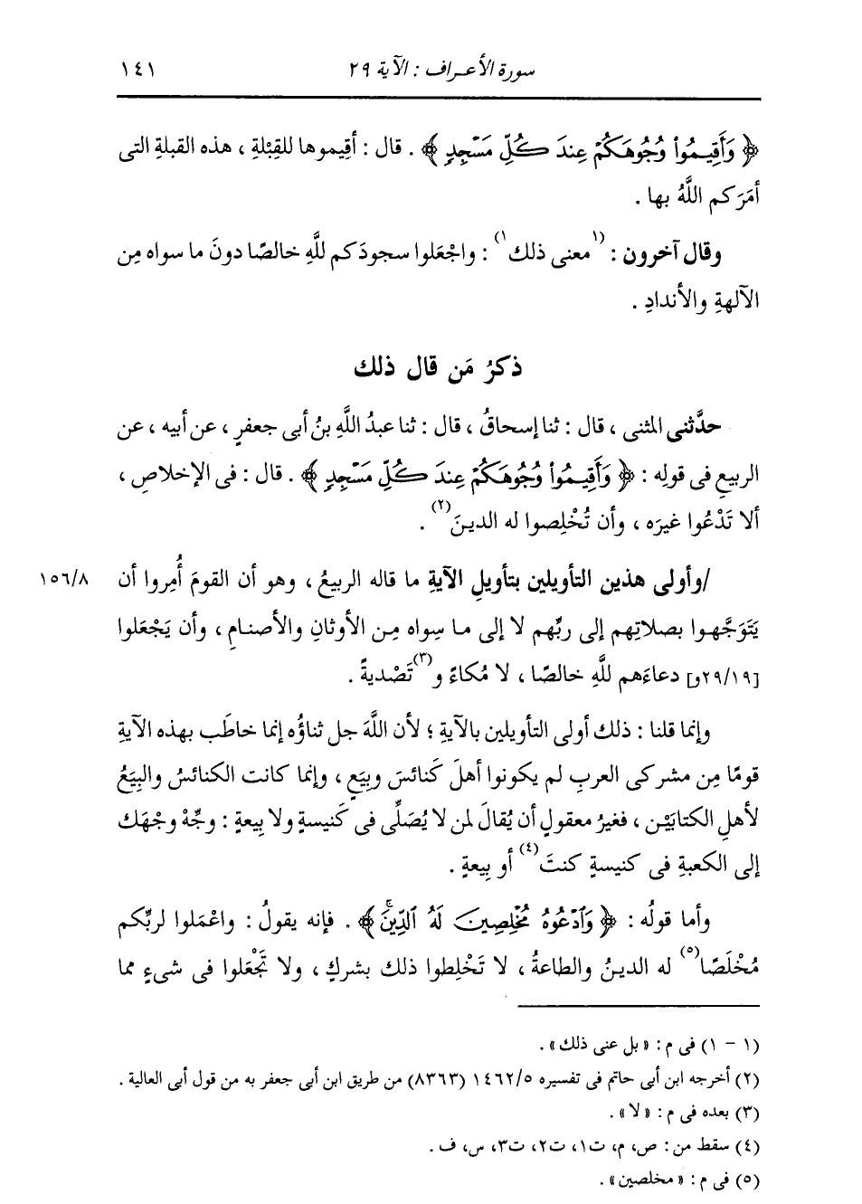 ذِكْرُ مَنْ قَالَ ذَلِكَ حَدَّثَنِي الْمُثَنَّى، قَالَ: ثنا إِسْحَاقُ، قَالَ: ثنا عَبْدُ اللَّهِ بْنُ أَبِي جَعْفَرٍ، عَنْ أَبِيهِ، عَنِ الرَّبِيعِ، فِي قَوْلِهِ: {§وَأَقِيمُوا وُجُوهَكُمْ عِنْدَ كُلِّ مَسْجِدٍ} [الأعراف: 29] ، قَالَ: «فِي الْإِخْلَاصِ أَنْ لَا تَدْعُوا غَيْرَهُ، وَأَنْ تُخْلِصُوا لَهُ الدِّينَ» قَالَ أَبُو جَعْفَرٍ: وَأَوْلَى هَذَيْنِ التَّأْوِيلَيْنِ بِتَأْوِيلِ الْآيَةِ مَا قَالَهُ الرَّبِيعُ، وَهُوَ أَنَّ الْقَوْمَ أُمِرُوا أَنْ يَتَوَجَّهُوا بِصَلَاتِهِمْ إِلَى رَبِّهِمْ، لَا إِلَى مَا سِوَاهُ مِنَ الْأَوْثَانِ وَالْأَصْنَامِ، وَأَنْ يَجْعَلُوا دُعَاءَهُمْ لِلَّهِ خَالِصًا، لَا مُكَاءَ وَلَا تَصْدِيَةَ. وَإِنَّمَا قُلْنَا ذَلِكَ أَوْلَى التَّأْوِيلَيْنِ بِالْآيَةِ، لِأَنَّ اللَّهَ إِنَّمَا خَاطَبَ بِهَذِهِ الْآيَةِ قَوْمًا مِنْ مُشْرِكِي الْعَرَبِ لَمْ يَكُونُوا أَهْلَ كَنَائِسَ وَبِيَعٍ، وَإِنَّمَا كَانَتِ الْكَنَائِسُ وَالْبِيَعُ لِأَهْلِ الْكِتَابَيْنِ، فَغَيْرُ مَعْقُولٍ أَنْ يُقَالَ لِمَنْ لَا يُصَلِّي فِي كَنِيسَةٍ وَلَا بَيْعَةٍ: وَجِّهْ وَجْهَكَ إِلَى الْكَعْبَةِ فِي كَنِيسَةٍ أَوْ بَيْعَةٍ