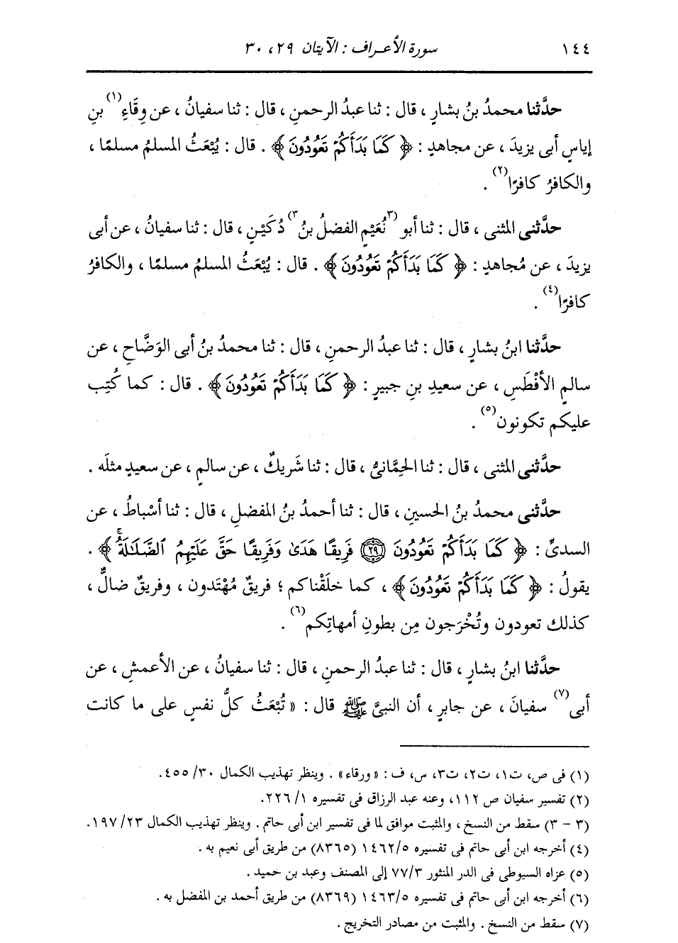 حَدَّثَنَا ابْنُ بَشَّارٍ، قَالَ: ثنا عَبْدُ الرَّحْمَنِ، قَالَ: ثنا مُحَمَّدُ بْنُ أَبِي الْوَضَّاحِ، عَنْ سَالِمٍ الْأَفْطَسِ، عَنْ سَعِيدِ بْنِ جُبَيْرٍ: {§كَمَا بَدَأَكُمْ تَعُودُونَ} [الأعراف: 29] ، قَالَ: «كَمَا كَتَبَ عَلَيْكُمْ تَكُونُونَ» حَدَّثَنِي الْمُثَنَّى قَالَ: ثنا الْحِمَّانِيُّ قَالَ: ثنا شَرِيكٌ، عَنْ سَالِمٍ، عَنْ سَعِيدٍ، مِثْلَهُ