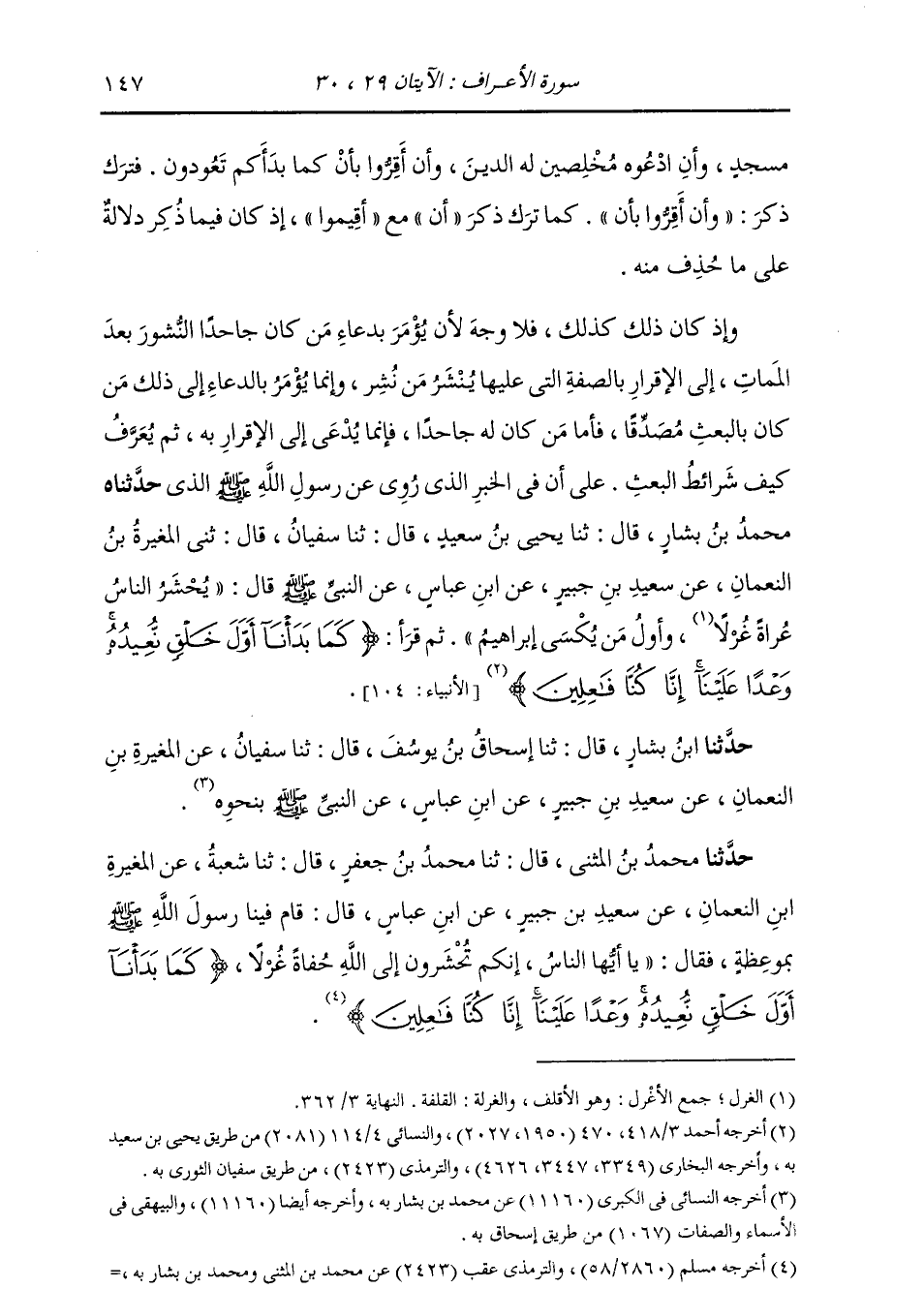 الَّذِي حَدَّثَنَاهُ مُحَمَّدُ بْنُ بَشَّارٍ، قَالَ: ثنا يَحْيَى بْنُ سَعِيدٍ، قَالَ: ثنا سُفْيَانُ، قَالَ: ثني الْمُغِيرَةُ بْنُ النُّعْمَانِ، عَنْ سَعِيدِ بْنِ جُبَيْرٍ، عَنِ ابْنِ عَبَّاسٍ، عَنِ النَّبِيِّ صَلَّى اللهُ عَلَيْهِ وَسَلَّمَ قَالَ: «§يُحْشَرُ النَّاسُ عُرَاةً غُرْلًا، وَأَوَّلُ مَنْ يُكْسَى إِبْرَاهِيمُ صَلَّى اللهُ عَلَيْهِ وَسَلَّمَ» ، ثُمَّ قَرَأَ: {كَمَا بَدَأْنَا أَوَّلَ خَلْقٍ نُعِيدُهُ وَعْدًا عَلَيْنَا إِنَّا كُنَّا فَاعِلِينَ} [الأنبياء: 104] حَدَّثَنَا ابْنُ بَشَّارٍ قَالَ: ثنا إِسْحَاقُ بْنُ يُوسُفَ قَالَ: ثنا سُفْيَانُ، عَنِ الْمُغِيرَةِ بْنِ النُّعْمَانِ، عَنْ سَعِيدِ بْنِ جُبَيْرٍ، عَنِ ابْنِ عَبَّاسٍ، عَنِ النَّبِيِّ صَلَّى اللهُ عَلَيْهِ وَسَلَّمَ، بِنَحْوِهِ