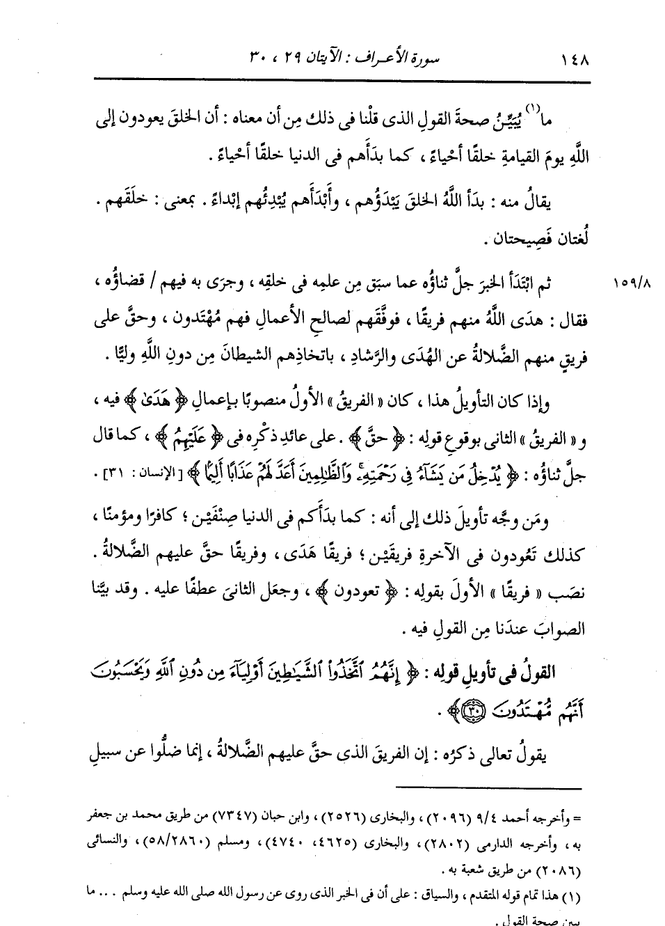 §الْقَوْلُ فِي تَأْوِيلِ قَوْلِهِ تَعَالَى: {إِنَّهُمُ اتَّخَذُوا الشَّيَاطِينَ أَوْلِيَاءَ مِنْ دُونِ اللَّهِ وَيَحْسَبُونَ أَنَّهُمْ مُهْتَدُونَ} [الأعراف: 30] يَقُولُ تَعَالَى ذِكْرُهُ: إِنَّ الْفَرِيقَ الَّذِي حَقَّ عَلَيْهِمُ الضَّلَالَةُ إِنَّمَا ضَلُّوا عَنْ سَبِيلِ
