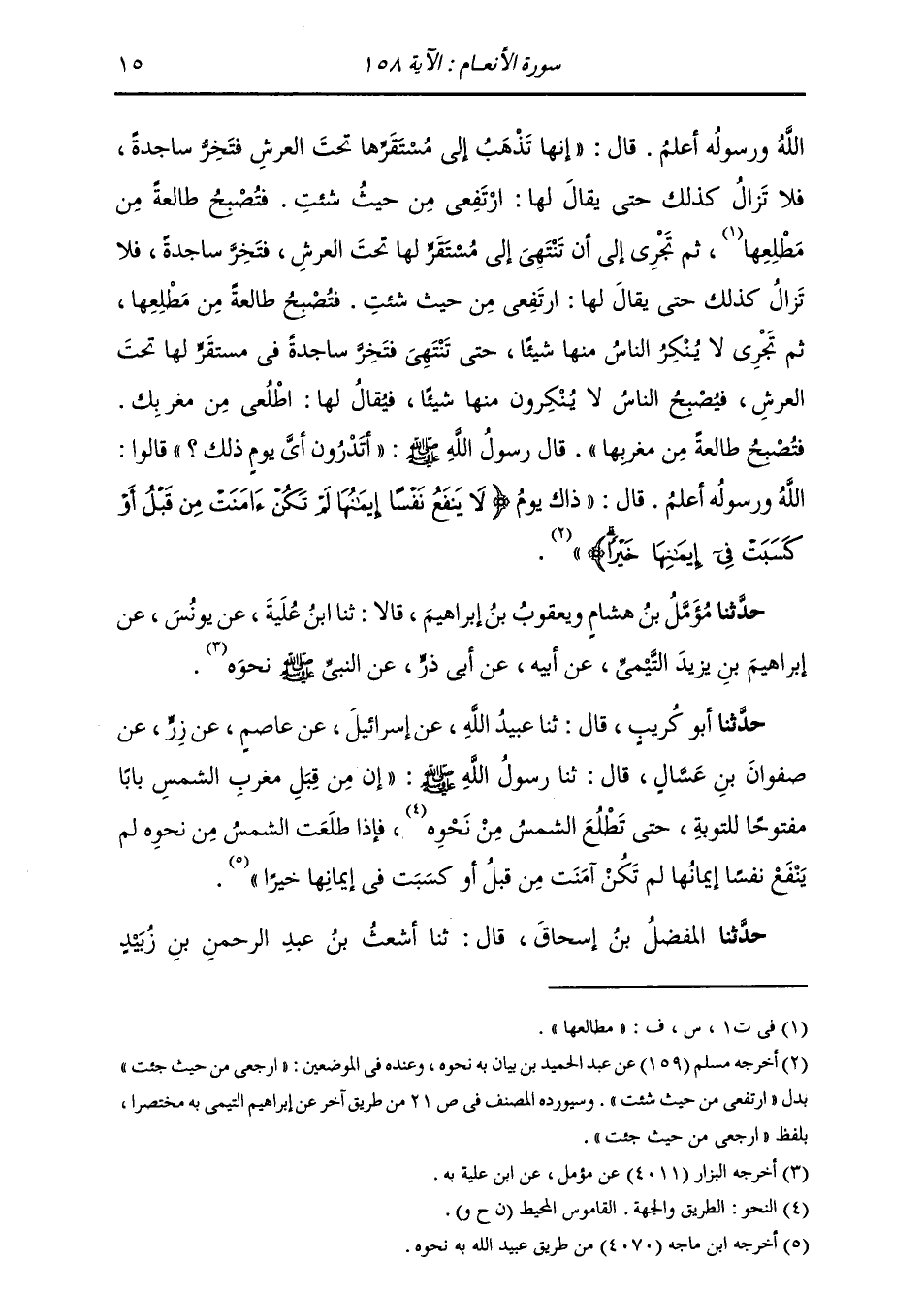 حَدَّثَنَا أَبُو كُرَيْبٍ، قَالَ: ثنا عُبَيْدُ اللَّهِ، عَنْ إِسْرَائِيلَ، عَنْ عَاصِمٍ، عَنْ زِرٍّ، عَنْ صَفْوَانَ بْنِ عَسَّالٍ، قَالَ: ثنا رَسُولُ اللَّهِ صَلَّى اللهُ عَلَيْهِ وَسَلَّمَ: «§إِنَّ مِنْ قِبَلِ مَغْرِبِ الشَّمْسِ بَابًا مَفْتُوحًا لِلتَّوْبَةِ حَتَّى تَطْلُعَ الشَّمْسُ مِنْ نَحْوِهِ، فَإِذَا طَلَعَتِ الشَّمْسُ مِنْ نَحْوِهِ لَمْ يَنْفَعْ نَفْسًا إِيمَانُهَا لَمْ تَكُنْ آمَنَتْ مِنْ قَبْلُ أَوْ كَسَبَتْ فِي إِيمَانِهَا خَيْرًا»