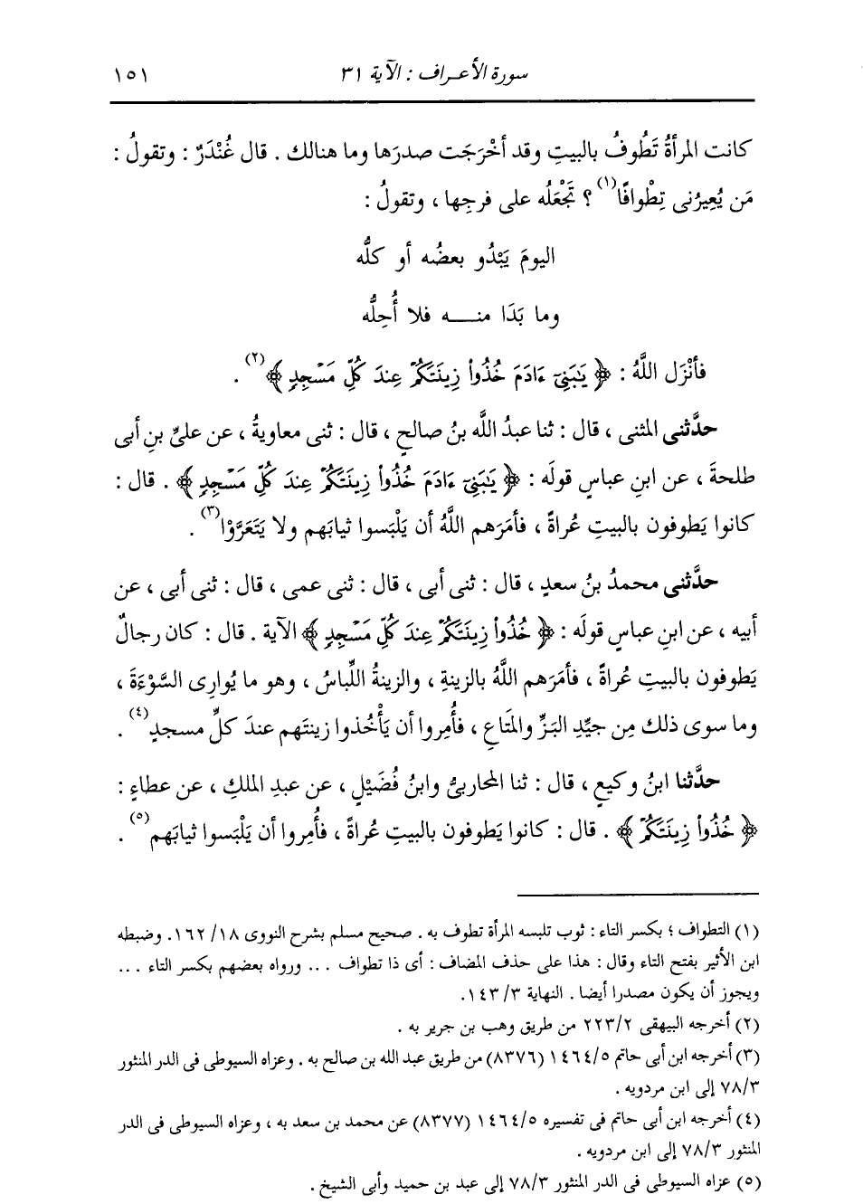 حَدَّثَنِي الْمُثَنَّى قَالَ: ثنا عَبْدُ اللَّهِ بْنُ صَالِحٍ قَالَ: ثني مُعَاوِيَةُ، عَنْ عَلِيِّ بْنِ أَبِي طَلْحَةَ، عَنِ ابْنِ عَبَّاسٍ، قَوْلُهُ: {§يَا بَنِي آدَمَ خُذُوا زِينَتَكُمْ عِنْدَ كُلِّ مَسْجِدٍ} [الأعراف: 31] ، قَالَ: «كَانُوا يَطُوفُونَ بِالْبَيْتِ عُرَاةً، فَأَمَرَهُمُ اللَّهُ أَنْ يَلْبَسُوا ثِيَابَهُمْ وَلَا يَتَعَرَّوْا»