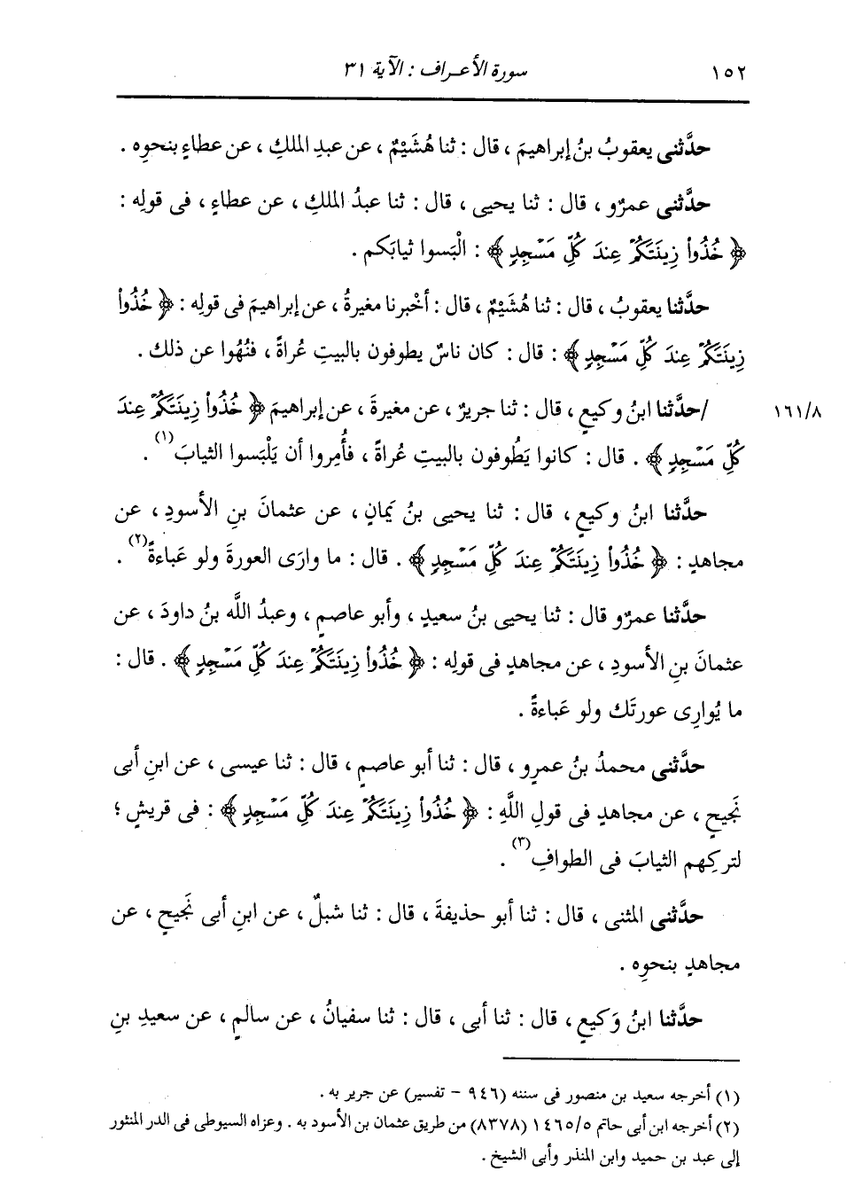 حَدَّثَنَا ابْنُ وَكِيعٍ، قَالَ: ثنا أَبِي قَالَ: ثنا سُفْيَانُ، عَنْ سَالِمٍ، عَنْ سَعِيدِ بْنِ -[153]- جُبَيْرٍ: {§خُذُوا زِينَتَكُمْ عِنْدَ كُلِّ مَسْجِدٍ} [الأعراف: 31] ، قَالَ: «الثِّيَابُ»
