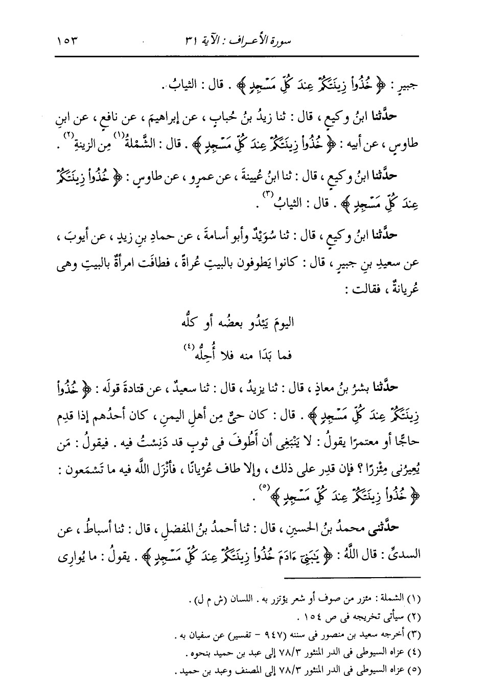 حَدَّثَنِي مُحَمَّدُ بْنُ الْحُسَيْنِ، قَالَ: ثنا أَحْمَدُ بْنُ الْمُفَضَّلِ، قَالَ: ثنا أَسْبَاطٌ، عَنِ السُّدِّيِّ: قَالَ اللَّهُ: {§يَا بَنِي آدَمَ خُذُوا زِينَتَكُمْ عِنْدَ كُلِّ مَسْجِدٍ} [الأعراف: 31] ، يَقُولُ: «مَا يُوَارِي -[154]- الْعَوْرَةَ عِنْدَ كُلِّ مَسْجِدٍ»