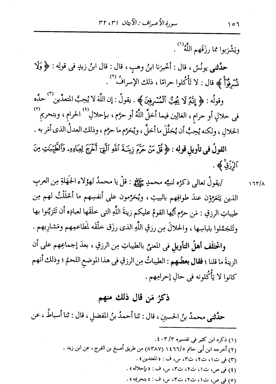 حَدَّثَنِي يُونُسُ، قَالَ: أَخْبَرَنَا ابْنُ وَهْبٍ، قَالَ: قَالَ ابْنُ زَيْدٍ، فِي قَوْلِهِ: {§وَلَا تُسْرِفُوا} [الأنعام: 141] : «لَا تَأْكُلُوا حَرَامًا ذَلِكَ الْإِسْرَافُ» وَقَوْلُهُ: {إِنَّهُ لَا يُحِبُّ الْمُسْرِفِينَ} [الأنعام: 141] يَقُولُ: إِنَّ اللَّهَ لَا يُحِبُّ الْمُتَعَدِّينَ حَدَّهُ فِي حَلَالٍ أَوْ حَرَامٍ، الْغَالِينَ فِيمَا أَحَلَّ اللَّهُ أَوْ حَرَّمَ بِإِحْلَالِ الْحَرَامِ وَبِتَحْرِيمِ الْحَلَالِ، وَلَكِنَّهُ يُحِبُّ أَنْ يُحَلَّلَ مَا أَحَلَّ وَيُحَرَّمَ مَا حَرَّمَ، وَذَلِكَ الْعَدْلُ الَّذِي أَمَرَ بِهِ