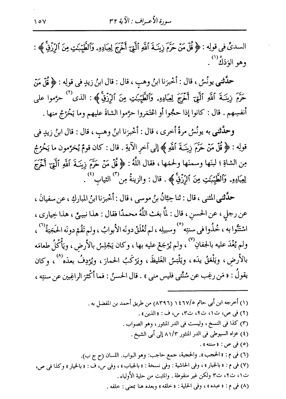 حَدَّثَنِي يُونُسُ، قَالَ: أَخْبَرَنَا ابْنُ وَهْبٍ، قَالَ: قَالَ ابْنُ زَيْدٍ، فِي قَوْلِهِ: {§قُلْ مَنْ حَرَّمَ زِينَةَ اللَّهِ الَّتِي أَخْرَجَ لِعِبَادِهِ وَالطَّيِّبَاتِ مِنَ الرِّزْقِ} [الأعراف: 32] " الَّذِي حَرَّمُوا عَلَى أَنْفُسِهِمْ، قَالَ: كَانُوا إِذَا حَجُّوا أَوِ اعْتَمَرُوا حَرَّمُوا الشَّاةَ عَلَيْهِمْ وَمَا يَخْرُجُ مِنْهَا "