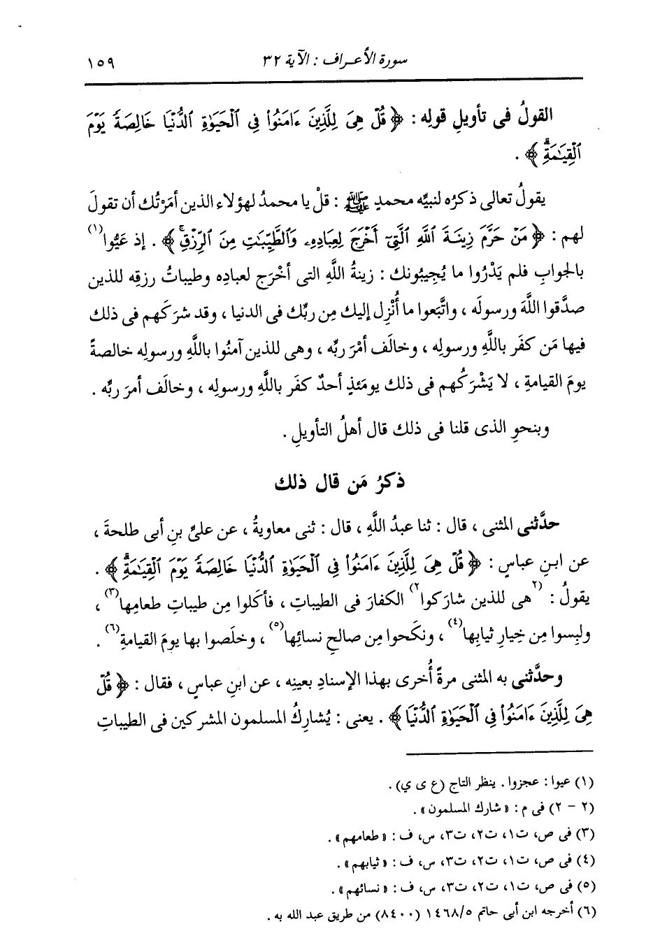 ذِكْرُ مَنْ قَالَ ذَلِكَ حَدَّثَنِي الْمُثَنَّى، قَالَ: ثنا عَبْدُ اللَّهِ، قَالَ: ثني مُعَاوِيَةُ، عَنْ عَلِيِّ بْنِ أَبِي طَلْحَةَ، عَنِ ابْنِ عَبَّاسٍ: {§قُلْ هِيَ لِلَّذِينَ آمَنُوا فِي الْحَيَاةِ الدُّنْيَا خَالِصَةً يَوْمَ الْقِيَامَةِ} [سورة: الأعراف، آية رقم: 32] يَقُولُ: «شَارَكَ الْمُسْلِمُونَ الْكُفَّارَ فِي الطَّيِّبَاتِ، فَأَكَلُوا مِنْ طَيِّبَاتِ طَعَامِهَا، وَلَبِسُوا مِنْ خِيَارِ ثِيَابِهَا، وَنَكَحُوا مِنْ صَالِحِ نِسَائِهَا، وَخَلَصُوا بِهَا يَوْمَ الْقِيَامَةِ»