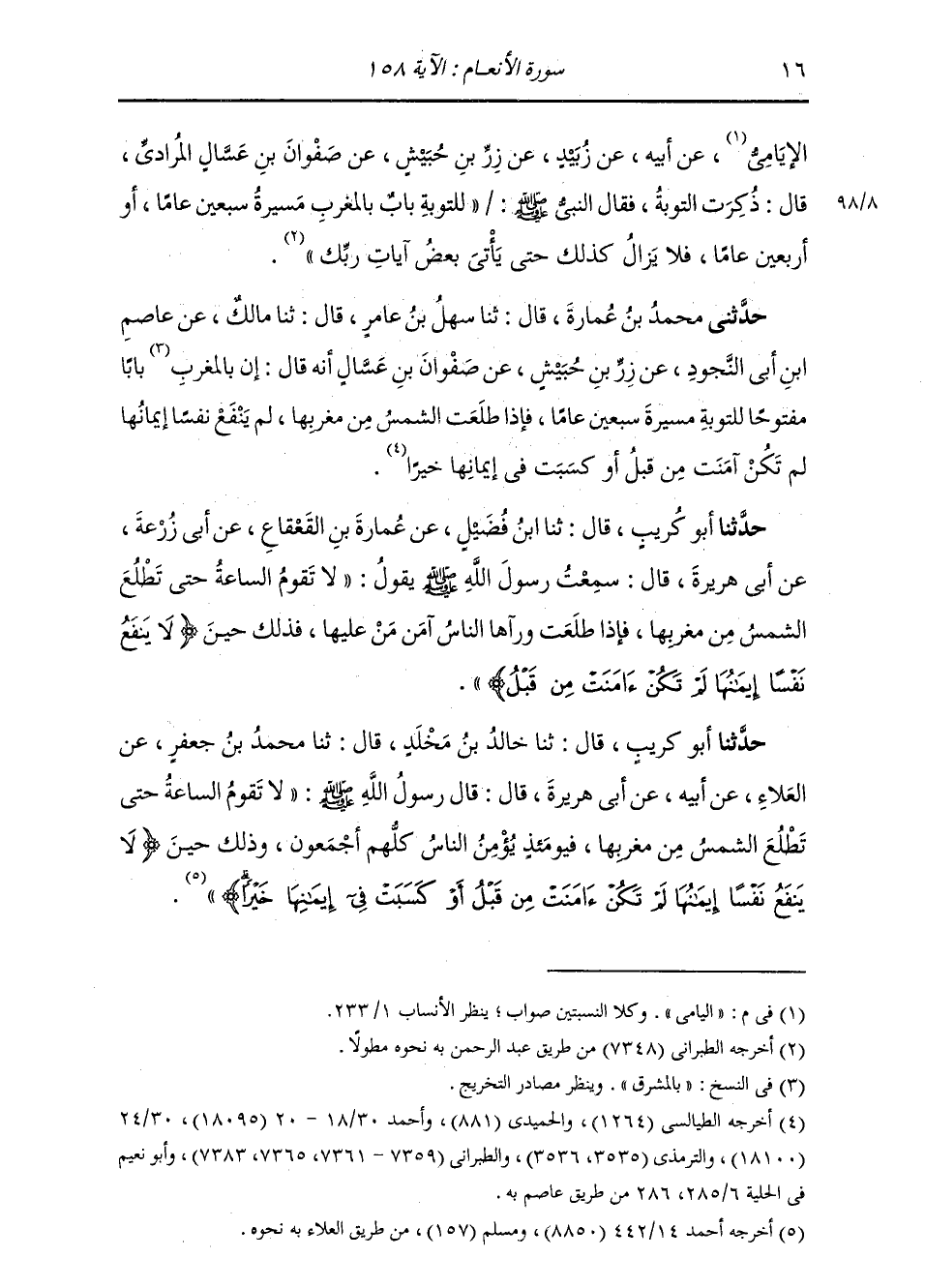 حَدَّثَنَا أَبُو كُرَيْبٍ قَالَ: ثنا خَالِدُ بْنُ مَخْلَدٍ قَالَ: ثنا مُحَمَّدُ بْنُ جَعْفَرٍ، عَنِ الْعَلَاءِ، عَنْ أَبِيهِ، عَنْ أَبِي هُرَيْرَةَ قَالَ: قَالَ رَسُولُ اللَّهِ صَلَّى اللهُ عَلَيْهِ وَسَلَّمَ: «§لَا تَقُومُ السَّاعَةُ حَتَّى تَطْلُعَ الشَّمْسُ مِنْ مَغْرِبِهَا، فَيَوْمَئِذٍ يُؤْمِنُ النَّاسُ كُلُّهُمْ أَجْمَعُونَ، وَذَلِكَ حِينَ لَا يَنْفَعُ نَفْسًا إِيمَانُهَا لَمْ تَكُنْ آمَنَتْ مِنْ قَبْلُ، أَوْ كَسَبَتْ فِي إِيمَانِهَا خَيْرًا»