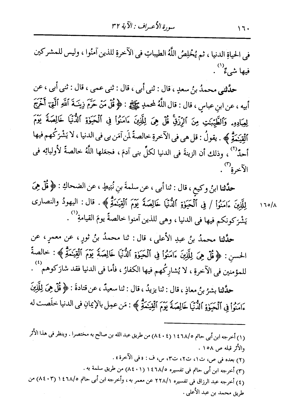 حَدَّثَنِي مُحَمَّدُ بْنُ سَعْدٍ قَالَ: ثني أَبِي قَالَ: ثني عَمِّي قَالَ: ثني أَبِي، عَنْ أَبِيهِ، عَنِ ابْنِ عَبَّاسٍ قَالَ: قَالَ لِمُحَمَّدٍ صَلَّى اللهُ عَلَيْهِ وَسَلَّمَ: {§قُلْ مَنْ حَرَّمَ زِينَةَ اللَّهِ الَّتِي أَخْرَجَ لِعِبَادِهِ وَالطَّيِّبَاتِ مِنَ الرِّزْقِ قُلْ هِيَ لِلَّذِينَ آمَنُوا فِي الْحَيَاةِ الدُّنْيَا خَالِصَةً يَوْمَ الْقِيَامَةِ} [الأعراف: 32] ، يَقُولُ: «قُلْ هِيَ فِي الْآخِرَةِ خَالِصَةً لِمَنْ آمَنَ بِي فِي الدُّنْيَا، لَا يشْرِكْهُمْ فِيهَا أَحَدٌ، وَذَلِكَ أَنَّ الزِّينَةَ فِي الدُّنْيَا لِكُلِّ بَنِي آدَمَ، فَجَعَلَهَا اللَّهُ خَالِصَةً لِأَوْلِيَائِهِ فِي الْآخِرَةِ»