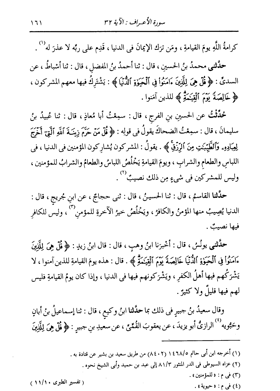 حُدِّثْتُ عَنِ الْحُسَيْنِ بْنِ الْفَرَجِ، قَالَ: سَمِعْتُ أَبَا مُعَاذٍ، قَالَ: ثنا عُبَيْدُ بْنُ سُلَيْمَانَ، قَالَ: سَمِعْتُ الضَّحَّاكَ، يَقُولُ فِي قَوْلِهِ: {§قُلْ مَنْ حَرَّمَ زِينَةَ اللَّهِ الَّتِي أَخْرَجَ لِعِبَادِهِ وَالطَّيِّبَاتِ مِنَ الرِّزْقِ قُلْ هِيَ لِلَّذِينَ آمَنُوا فِي الْحَيَاةِ الدُّنْيَا خَالِصَةً يَوْمَ الْقِيَامَةِ} [الأعراف: 32] ، يَقُولُ: «الْمُشْرِكُونَ يُشَارِكُونَ الْمُؤْمِنِينَ فِي الدُّنْيَا فِي اللِّبَاسِ وَالطَّعَامِ وَالشَّرَابِ، وَيَوْمَ الْقِيَامَةِ يَخْلُصُ اللِّبَاسُ وَالطَّعَامُ وَالشَّرَابُ لِلْمُؤْمِنِينَ، وَلَيْسَ لِلْمُشْرِكِينَ فِي شَيْءٍ مِنْ ذَلِكَ نَصِيبٌ»