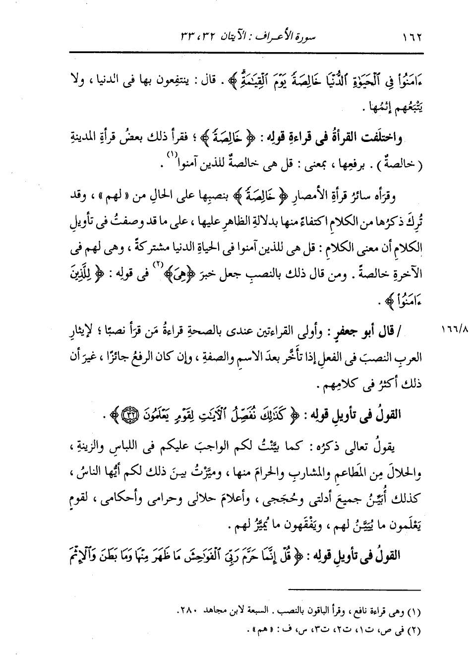 آمَنُوا فِي الْحَيَاةِ الدُّنْيَا خَالِصَةً يَوْمَ الْقِيَامَةِ} [الأعراف: 32] ، قَالَ: «يَنْتَفِعُونَ بِهَا فِي الدُّنْيَا، وَلَا يَتْبَعُهُمْ إِثْمُهَا» وَاخْتَلَفَتِ الْقُرَّاءُ فِي قِرَاءَةِ قَوْلِهِ: (خَالِصَةً) ، فَقَرَأَ ذَلِكَ بَعْضُ قُرَّاءِ الْمَدِينَةِ: (خَالِصَةٌ) بِرَفْعِهَا، بِمَعْنَى: قُلْ هِيَ خَالِصَةٌ لِلَّذِينَ آمَنُوا. وَقَرَأَهُ سَائِرُ قُرَّاءِ الْأَمْصَارِ: {خَالِصَةً} [الأعراف: 32] بِنَصْبِهَا عَلَى الْحَالِ مِنْ لَهُمْ، وَقَدْ تُرِكَ ذِكْرُهَا مِنَ الْكَلَامِ اكْتِفَاءً مِنْهَا بِدَلَالَةِ الظَّاهِرِ عَلَيْهَا، عَلَى مَا قَدْ وَصَفْتُ فِي تَأْوِيلِ الْكَلَامِ أَنَّ مَعْنَى الْكَلَامِ: قُلْ هِيَ لِلَّذِينَ آمَنُوا فِي الْحَيَاةِ الدُّنْيَا مُشْتَرَكَةٌ، وَهِيَ لَهُمْ فِي الْآخِرَةِ خَالِصَةٌ. وَمَنْ قَالَ ذَلِكَ بِالنَّصْبِ جَعَلَ خَبَرَ (هِيَ) فِي قَوْلِهِ: {لِلَّذِينَ آمَنُوا} [الأعراف: 32] . قَالَ أَبُو جَعْفَرٍ: وَأَوْلَى الْقِرَاءَتَيْنِ عِنْدِي بِالصِّحَّةِ قِرَاءَةُ مَنْ قَرَأَ نَصْبًا، لِإِيثَارِ الْعَرَبِ النَّصْبَ فِي الْفِعْلِ إِذَا تَأَخَّرَ بَعْدَ الِاسْمِ وَالصِّفَةِ وَإِنْ كَانَ الرَّفْعُ جَائِزًا، غَيْرَ أَنَّ ذَلِكَ أَكْثَرُ فِي كَلَامِهِمْ