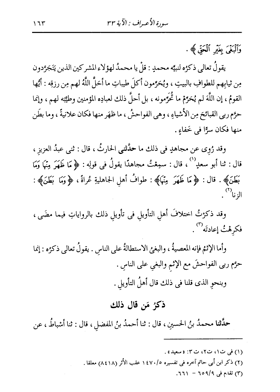 مَا حَدَّثَنِي الْحَرْثُ، قَالَ: ثني عَبْدُ الْعَزِيزِ قَالَ: ثنا أَبُو سَعْدٍ، قَالَ: سَمِعْتُ مُجَاهِدًا، يَقُولُ فِي قَوْلِهِ: {§مَا ظَهَرَ مِنْهَا وَمَا بَطَنَ} [الأعراف: 33] ، قَالَ: " مَا ظَهَرَ مِنْهَا طَوَافُ أَهْلِ الْجَاهِلِيَّةِ عُرَاةً، وَمَا بَطَنَ: الزِّنَا " وَقَدْ ذَكَرْتُ اخْتِلَافَ أَهْلِ التَّأْوِيلِ فِي تَأْوِيلِ ذَلِكَ بِالرِّوَايَاتِ فِيمَا مَضَى فَكَرِهْتُ إِعَادَتَهُ. وَأَمَّا الْإِثْمُ: فَإِنَّهُ الْمَعْصِيَةُ. وَالْبَغْي: الِاسْتِطَالَةُ عَلَى النَّاسِ. يَقُولُ تَعَالَى ذِكْرُهُ: إِنَّمَا حَرَّمَ رَبِّيَ الْفَوَاحِشَ مَعَ الْإِثْمِ وَالْبَغْيِ عَلَى النَّاسِ. وَبِنَحْوِ الَّذِي قُلْنَا فِي ذَلِكَ قَالَ أَهْلُ التَّأْوِيلِ
