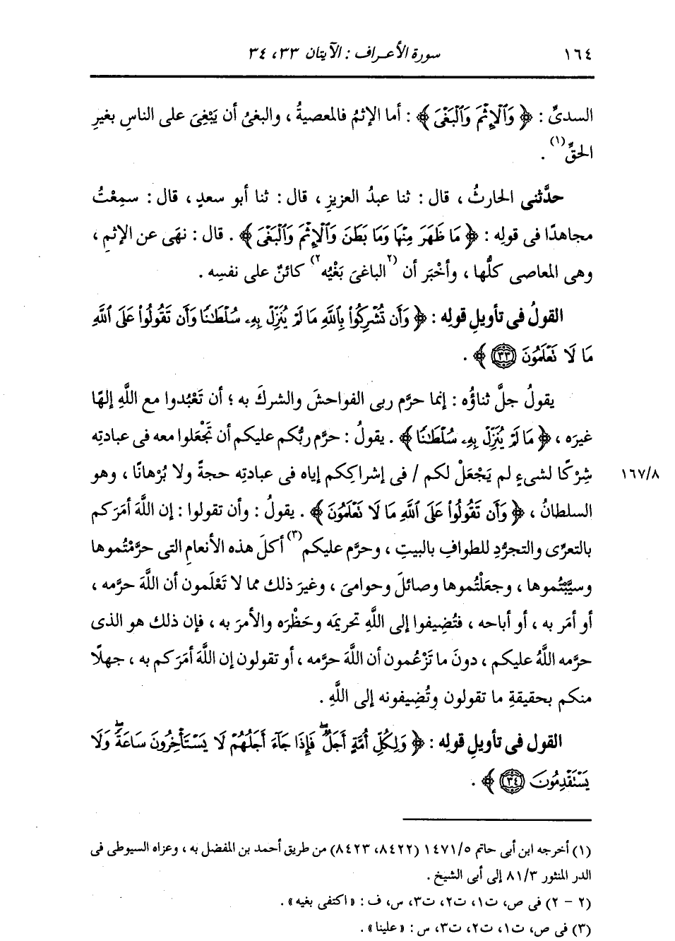 §الْقَوْلُ فِي تَأْوِيلِ قَوْلِهِ تَعَالَى: {وَأَنْ تُشْرِكُوا بِاللَّهِ مَا لَمْ يُنَزِّلْ بِهِ سُلْطَانًا وَأَنْ تَقُولُوا عَلَى اللَّهِ مَا لَا تَعْلَمُونَ} [الأعراف: 33] يَقُولُ جَلَّ ثَنَاؤُهُ: إِنَّمَا حَرَّمَ رَبِّيَ الْفَوَاحِشَ وَالشِّرْكَ بِهِ أَنْ تَعْبُدُوا مَعَ اللَّهِ إِلَهًا غَيْرَهُ، {مَا لَمْ يُنَزِّلْ بِهِ سُلْطَانًا} [آل عمران: 151] يَقُولُ: حَرَّمَ رَبُّكُمْ عَلَيْكُمْ أَنْ تَجْعَلُوا مَعَهُ فِي عِبَادَتِهِ شِرْكًا لِشَيْءٍ لَمْ يَجْعَلْ لَكُمْ فِي إِشْرَاكِكُمْ إِيَّاهُ فِي عِبَادَتِهِ حُجَّةً وَلَا بُرْهَانًا، وَهُوَ السُّلْطَانُ. {وَأَنْ تَقُولُوا عَلَى اللَّهِ مَا لَا تَعْلَمُونَ} [البقرة: 169] يَقُولُ: وَأَنْ تَقُولُوا: إِنَّ اللَّهَ أَمَرَكُمْ بِالتَّعَرِّي وَالتَّجَرُّدِ لِلطَّوَافِ بِالْبَيْتِ، وَحَرَّمَ عَلَيْكُمْ أَكْلَ هَذِهِ الْأَنْعَامِ الَّتِي حَرَّمْتُمُوهَا وَسَيَّبْتُمُوهَا وَجَعَلْتُمُوهَا وَصَائِلَ وَحَوَامِيَ، وَغَيْرَ ذَلِكَ مِمَّا لَا تَعْلَمُونَ أَنَّ اللَّهَ حَرَّمَهُ أَوْ أَمَرَ بِهِ أَوْ أَبَاحَهُ، فَتُضِيفُوا إِلَى اللَّهِ تَحْرِيمَهُ وَحَظْرَهُ وَالْأَمْرَ بِهِ، فَإِنَّ ذَلِكَ هُوَ الَّذِي حَرَّمَهُ اللَّهُ عَلَيْكُمْ دُونَ مَا تَزْعُمُونَ أَنَّ اللَّهَ حَرَّمَهُ أَوْ تَقُولُونَ إِنَّ اللَّهَ أَمَرَكُمْ بِهِ جَهْلًا مِنْكُمْ بِحَقِيقَةِ مَا تَقُولُونَ وَتُضِيفُونَهُ إِلَى اللَّهِ