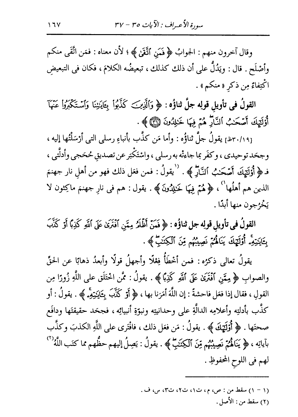 وَقَالَ آخَرُونَ مِنْهُمُ: الْجَوَابُ: {فَمَنِ اتَّقَى} [الأعراف: 35] ، لِأَنَّ مَعْنَاهُ: فَمَنِ اتَّقَى مِنْكُمْ وَأَصْلَحَ، قَالَ: وَيَدُلُّ عَلَى أَنَّ ذَلِكَ كَذَلِكَ تَبْعِيضُهُ الْكَلَامَ، فَكَانَ فِي التَّبْعِيضِ اكْتِفَاءٌ مِنْ ذِكْرِ (مِنْكُمْ)
