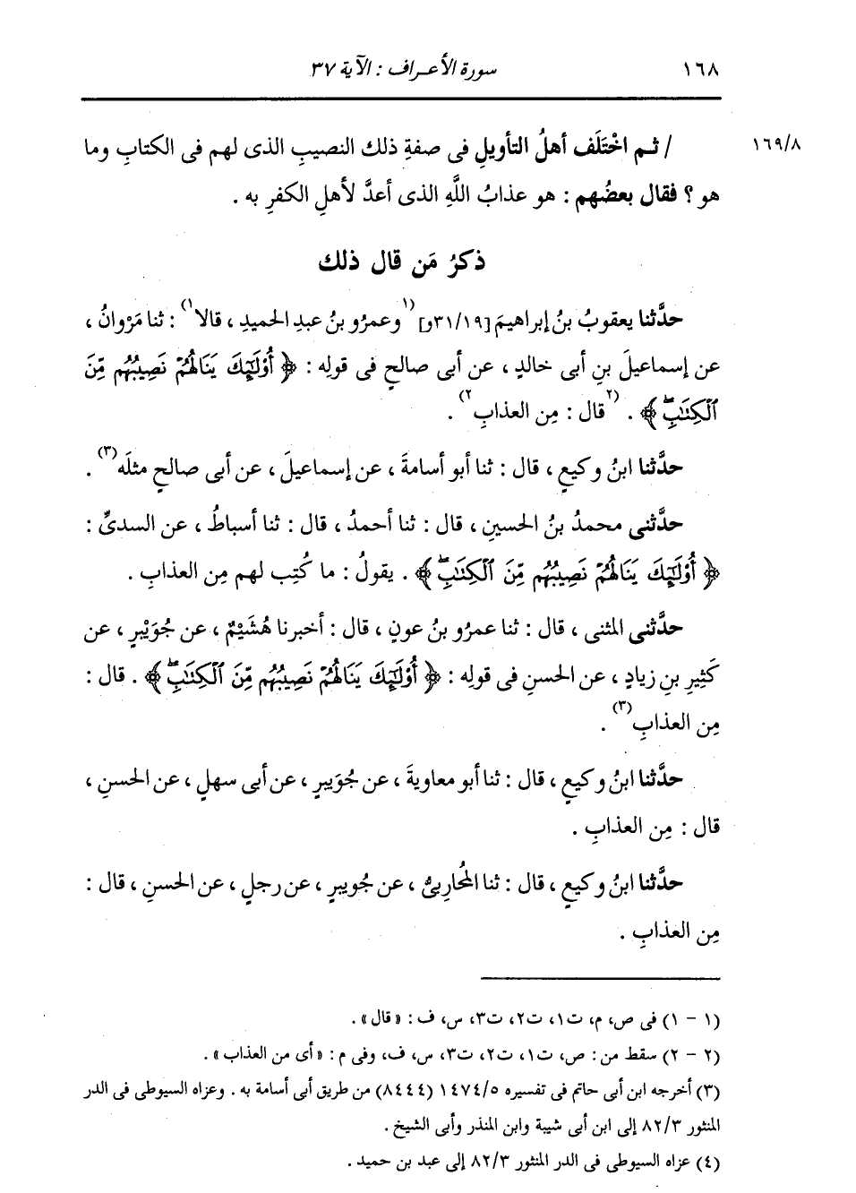 ذِكْرُ مَنْ قَالَ ذَلِكَ حَدَّثَنَا يَعْقُوبُ بْنُ إِبْرَاهِيمَ، قَالَ: ثنا مَرْوَانٌ، عَنْ إِسْمَاعِيلَ بْنِ أَبِي خَالِدٍ، عَنْ أَبِي صَالِحٍ، قَوْلُهُ: {§أُولَئِكَ يَنَالُهُمْ نَصِيبُهُمْ مِنَ الْكِتَابِ} [الأعراف: 37] : «أَيْ مِنَ الْعَذَابِ» حَدَّثَنَا ابْنُ وَكِيعٍ قَالَ: ثنا أَبُو أُسَامَةَ، عَنْ إِسْمَاعِيلَ، عَنْ أَبِي صَالِحٍ، مِثْلَهُ