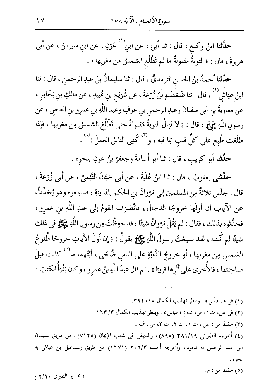 حَدَّثَنِي يَعْقُوبُ، قَالَ: ثنا ابْنُ عُلَيَّةَ، عَنْ أَبِي حَيَّانَ التَّيْمِيِّ، عَنْ أَبِي زُرْعَةَ، قَالَ: " جَلَسَ ثَلَاثَةٌ مِنَ الْمُسْلِمِينَ إِلَى مَرْوَانَ بْنِ الْحَكَمِ بِالْمَدِينَةِ، فَسَمِعُوهُ وَهُوَ يُحَدِّثُ عَنِ الْآيَاتِ، أَنَّ أَوَّلَهَا خُرُوجًا الدَّجَّالُ. فَانْصَرَفَ الْقَوْمُ إِلَى عَبْدِ اللَّهِ بْنِ عَمْرٍو، فَحَدَّثُوهُ بِذَلِكَ، فَقَالَ: لَمْ يَقُلْ مَرْوَانُ شَيْئًا، قَدْ حَفِظْتُ مِنْ رَسُولِ اللَّهِ صَلَّى اللهُ عَلَيْهِ وَسَلَّمَ فِي ذَلِكَ شَيْئًا لَمْ أَنْسَهْ، لَقَدْ سَمِعْتُ رَسُولَ اللَّهِ صَلَّى اللهُ عَلَيْهِ وَسَلَّمَ يَقُولُ: " §إِنَّ أَوَّلَ الْآيَاتِ خُرُوجًا: طُلُوعُ الشَّمْسِ مِنْ مَغْرِبِهَا، أَوْ خُرُوجُ الدَّابَّةِ عَلَى النَّاسِ ضُحًى، أَيَّتُهُمَا كَانَتْ قَبْلَ صَاحِبَتِهَا فَالْأُخْرَى عَلَى أَثَرِهَا قَرِيبًا "، ثُمَّ قَالَ عَبْدُ اللَّهِ بْنُ عَمْرٍو وَكَانَ يَقْرَأُ الْكُتُبَ: -[18]- أَظُنُّ أَوَّلَهُمَا خُرُوجًا طُلُوعَ الشَّمْسِ مِنْ مَغْرِبِهَا، وَذَلِكَ أَنَّهَا كُلَّمَا غَرَبَتْ أَتَتْ تَحْتَ الْعَرْشِ فَسَجَدَتْ وَاسْتَأْذَنَتْ فِي الرُّجُوعِ، فَيُؤْذَنُ لَهَا فِي الرُّجُوعِ، حَتَّى إِذَا بَدَا لِلَّهِ أَنْ تَطْلُعَ مِنْ مَغْرِبِهَا فَعَلَتْ كَمَا كَانَتْ تَفْعَلُ أَتَتْ تَحْتَ الْعَرْشِ فَسَجَدَتْ وَاسْتَأْذَنَتْ فِي الرُّجُوعِ، فَلَمْ يَرُدَّ عَلَيْهَا شَيْئًا، فَتَفْعَلُ ذَلِكَ ثَلَاثَ مَرَّاتٍ لَا يَرُدُّ عَلَيْهَا بِشَيْءٍ، حَتَّى إِذَا ذَهَبَ مِنَ اللَّيْلِ مَا شَاءَ اللَّهُ أَنْ يَذْهَبَ، وَعَرَفَتْ أَنْ لَوَ أَذِنَ لَهَا لَمْ تُدْرِكِ الْمَشْرِقَ قَالَتْ: مَا أَبْعَدَ الْمَشْرِقَ رَبِّ مَنْ لِي بِالنَّاسِ، حَتَّى إِذَا صَارَ الْأُفُقُ كَأَنَّهُ طَوْقٌ اسْتَأْذَنَتْ فِي الرُّجُوعِ، فَقِيلَ لَهَا: اطْلُعِي مِنْ مَكَانِكِ، فَتَطْلُعُ مِنْ مَغْرِبِهَا، ثُمَّ قَرَأَ: {يَوْمَ يَأْتِي بَعْضُ آيَاتِ رَبِّكَ لَا يَنْفَعُ نَفْسًا إِيمَانُهَا} [الأنعام: 158] إِلَى آخِرِ الْآيَةِ حَدَّثَنِي الْمُثَنَّى قَالَ: ثنا أَبُو رَبِيعَةَ فَهْدٌ قَالَ: ثنا حَمَّادٌ، عَنْ يَحْيَى بْنِ سَعِيدٍ أَبِي حَيَّانَ، عَنِ الشَّعْبِيِّ، أَنَّ ثَلَاثَةَ نَفَرٍ دَخَلُوا عَلَى مَرْوَانَ بْنِ الْحَكَمِ، فَذَكَرَ نَحْوَهُ، عَنْ عَبْدِ اللَّهِ بْنِ عَمْرٍو