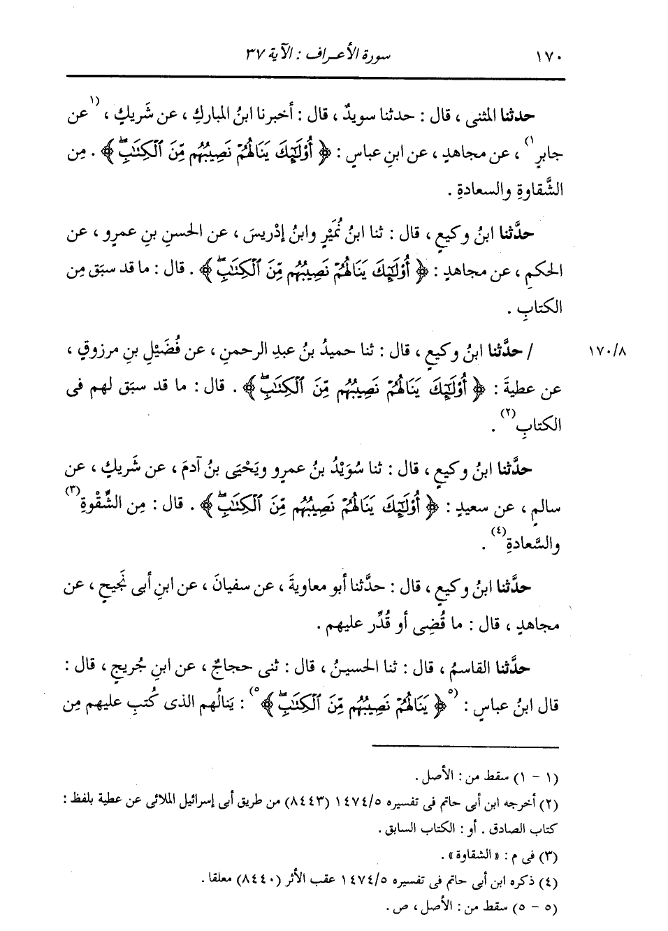 قَالَ: ثنا سُوَيْدُ بْنُ عَمْرٍو وَيَحْيَى بْنُ آدَمَ، عَنْ شَرِيكٍ، عَنْ سَالِمٍ، عَنْ سَعِيدٍ: {§أُولَئِكَ يَنَالُهُمْ نَصِيبُهُمْ} [الأعراف: 37] ، قَالَ: «مِنَ الشَّقَاوَةِ وَالسَّعَادَةِ»
