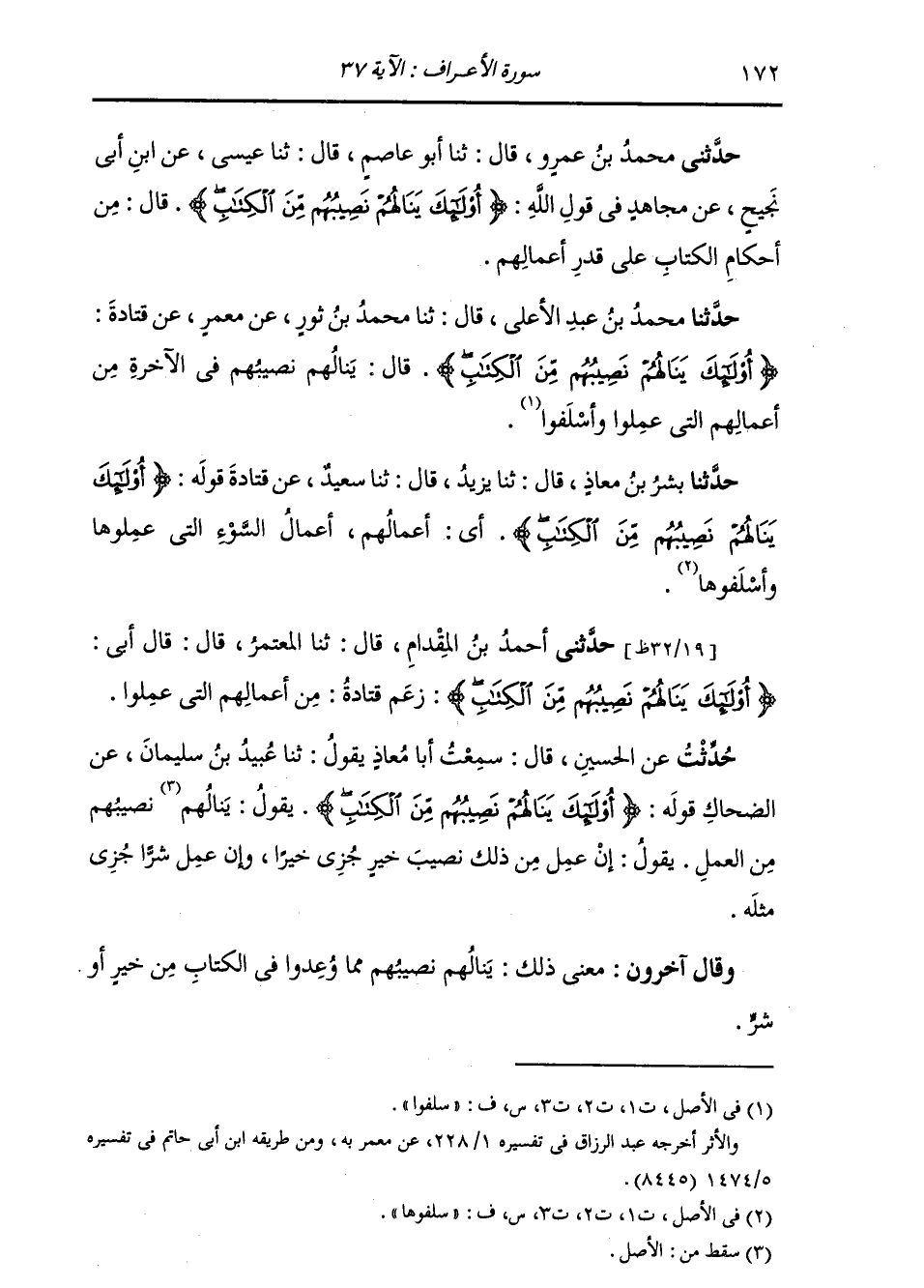 حَدَّثَنِي أَحْمَدُ بْنُ الْمِقْدَامِ قَالَ: ثنا الْمُعْتَمِرُ قَالَ: قَالَ أَبِي: {§أُولَئِكَ يَنَالُهُمْ نَصِيبُهُمْ مِنَ الْكِتَابِ} [الأعراف: 37] " زَعَمَ قَتَادَةُ: «مِنْ أَعْمَالِهِمُ الَّتِي عَمِلُوا»