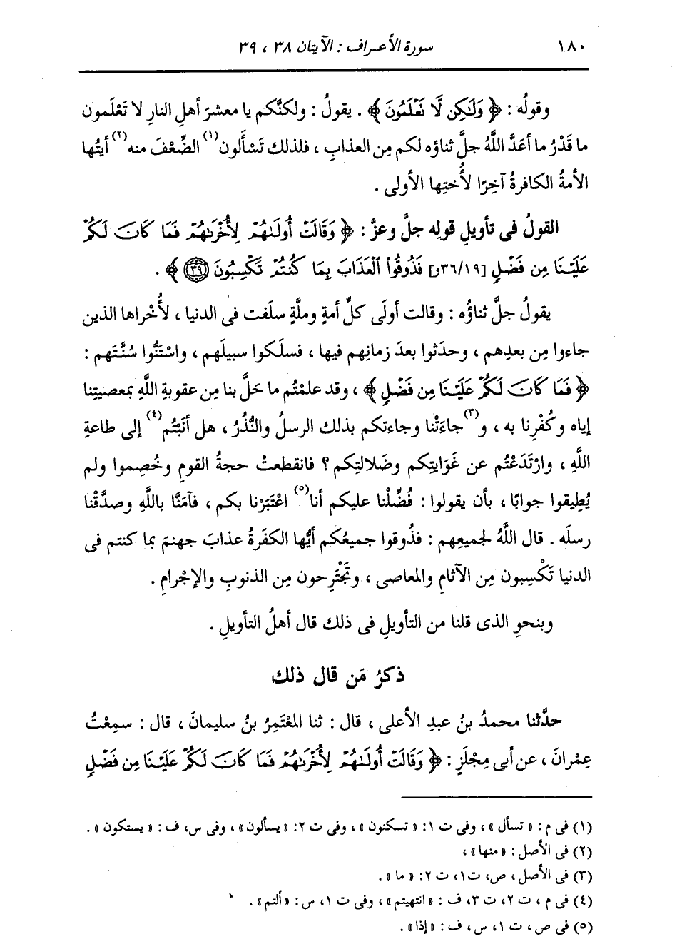 ذِكْرُ مَنْ قَالَ ذَلِكَ حَدَّثَنَا مُحَمَّدُ بْنُ عَبْدِ الْأَعْلَى، قَالَ: ثنا الْمُعْتَمِرُ، قَالَ: سَمِعْتُ عِمْرَانَ، عَنْ أَبِي مِجْلَزٍ: {§وَقَالَتْ أُولَاهُمْ لِأُخْرَاهُمْ فَمَا كَانَ لَكُمْ عَلَيْنَا مِنْ فَضْلٍ -[181]- فَذُوقُوا الْعَذَابَ بِمَا كُنْتُمْ تَكْسِبُونَ} [الأعراف: 39] ، قَالَ: يَقُولُ: «فَمَا فَضْلُكُمْ عَلَيْنَا، وَقَدْ بُيِّنَ لَكُمْ مَا صُنِعَ بِنَا، وَحُذِّرْتُمْ»
