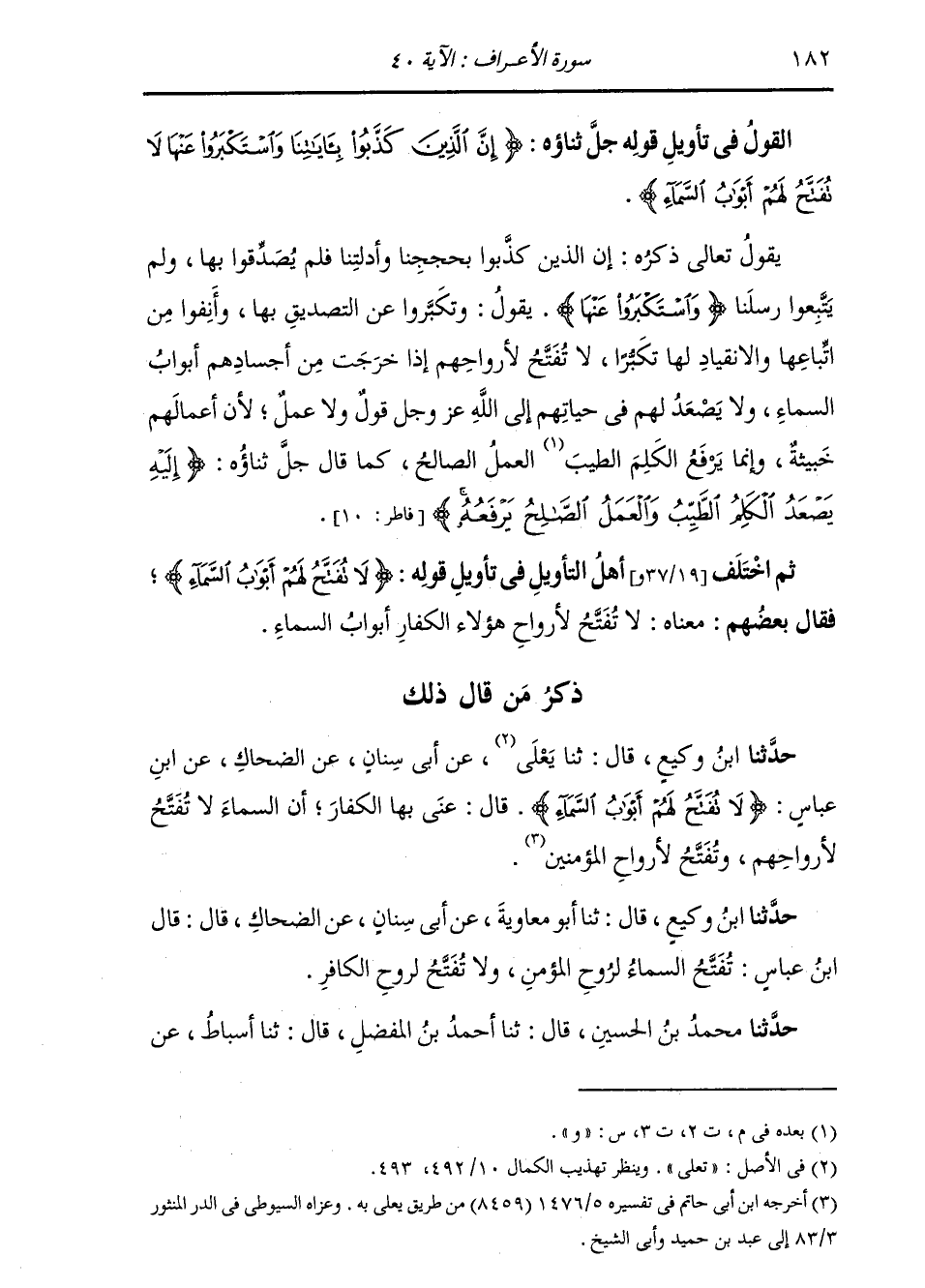 ذِكْرُ مَنْ قَالَ ذَلِكَ حَدَّثَنَا ابْنُ وَكِيعٍ، قَالَ: ثنا يَعْلَى، عَنْ أَبِي سِنَانٍ، عَنِ الضَّحَّاكِ، عَنِ ابْنِ عَبَّاسٍ: {§لَا تُفَتَّحُ لَهُمْ أَبْوَابُ السَّمَاءِ} [الأعراف: 40] قَالَ: «عَنَى بِهَا الْكُفَّارَ، أَنَّ السَّمَاءَ لَا تُفَتَّحُ لِأَرْوَاحِهِمْ وَتُفَتَّحُ لِأَرْوَاحِ الْمُؤْمِنِينَ»