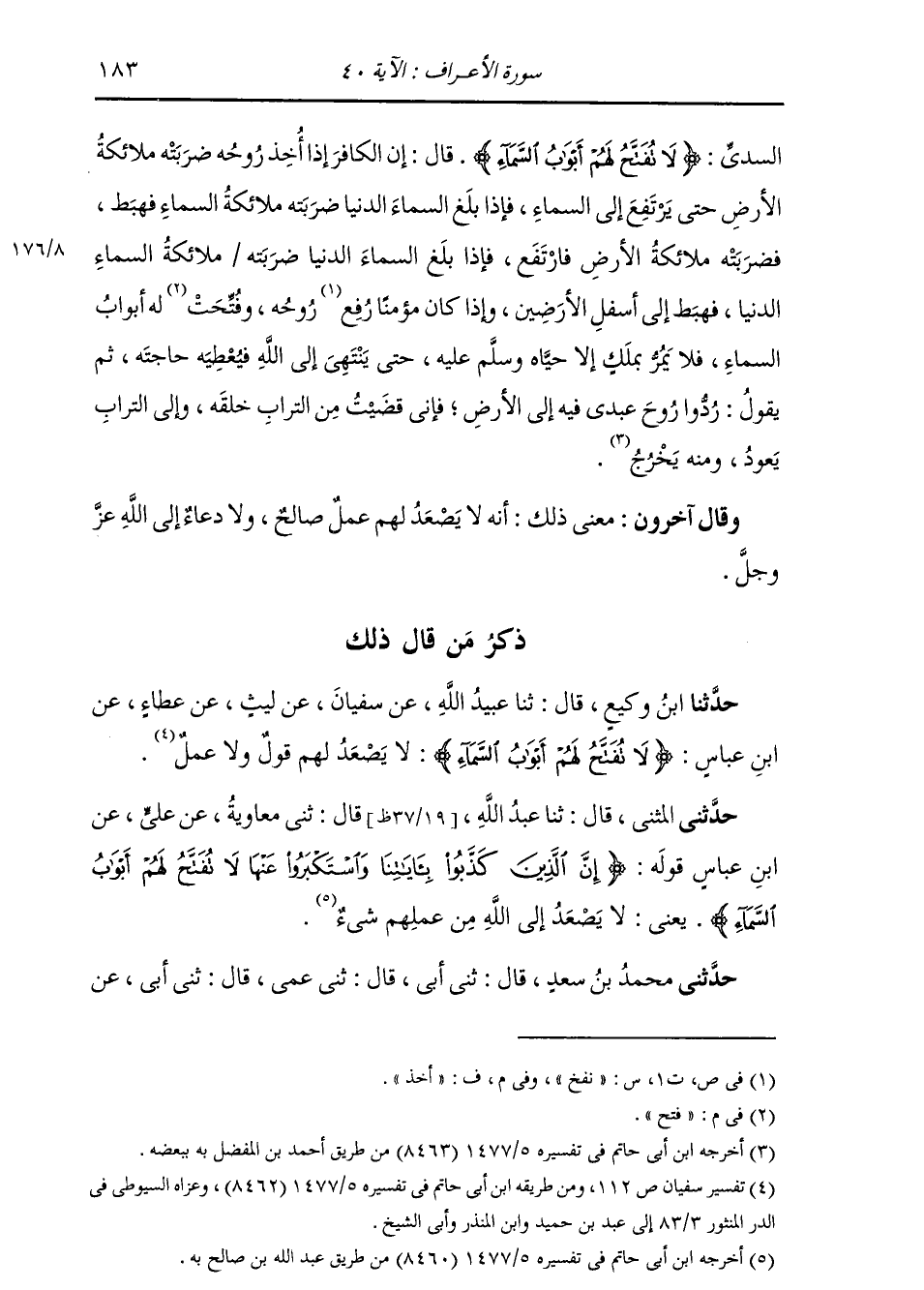 حَدَّثَنِي الْمُثَنَّى قَالَ: ثنا عَبْدُ اللَّهِ بْنُ صَالِحٍ قَالَ: ثني مُعَاوِيَةُ، عَنْ عَلِيِّ بْنِ أَبِي طَلْحَةَ، عَنِ ابْنِ عَبَّاسٍ، قَوْلُهُ: {§إِنَّ الَّذِينَ كَذَّبُوا بِآيَاتِنَا وَاسْتَكْبَرُوا عَنْهَا لَا تُفَتَّحُ لَهُمْ أَبْوَابُ السَّمَاءِ} [الأعراف: 40] يَعْنِي: «لَا يَصْعَدُ إِلَى اللَّهِ مِنْ عَمَلِهِمْ شَيْءٌ»