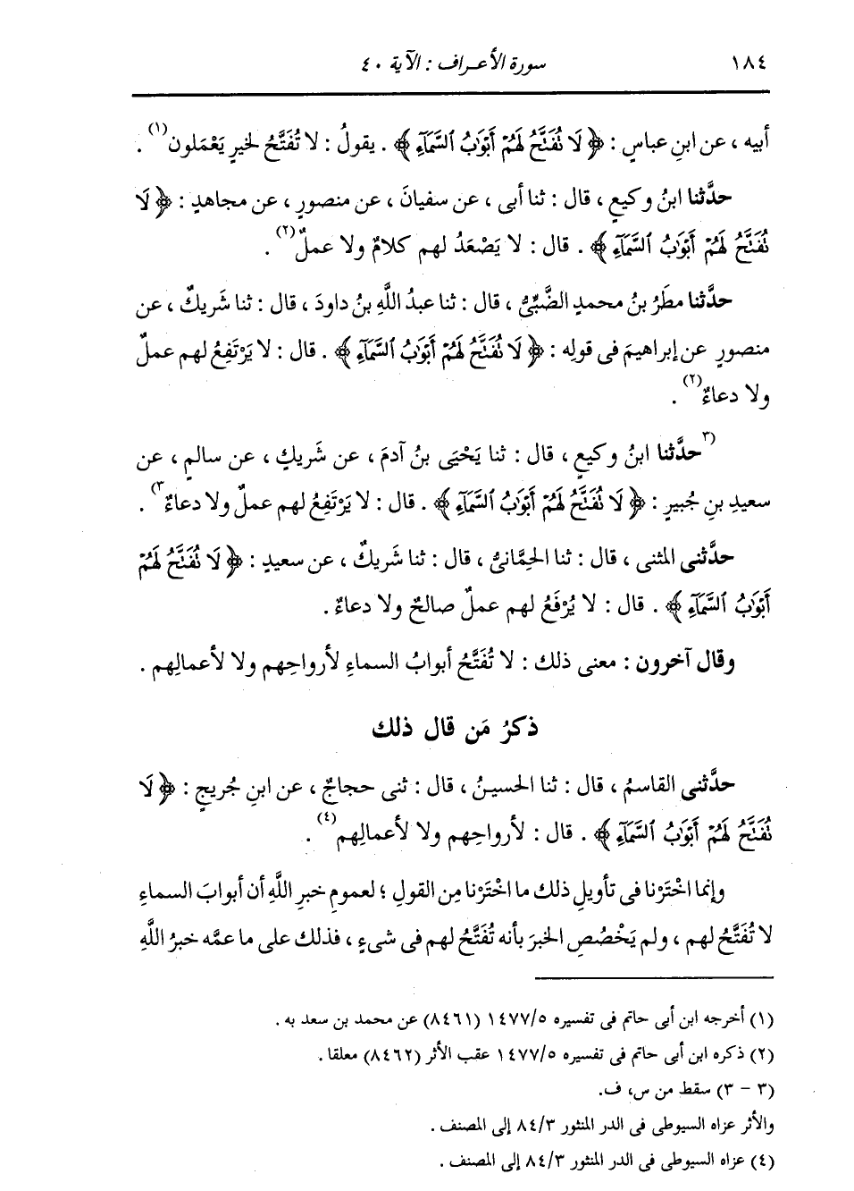 حَدَّثَنَا ابْنُ وَكِيعٍ، قَالَ: ثنا أَبِي، عَنْ سُفْيَانَ، عَنْ مَنْصُورٍ، عَنْ مُجَاهِدٍ: {§لَا تُفَتَّحُ لَهُمْ أَبْوَابُ السَّمَاءِ} [الأعراف: 40] قَالَ: «لَا يَصْعَدُ لَهُمْ كَلَامٌ وَلَا عَمَلٌ»