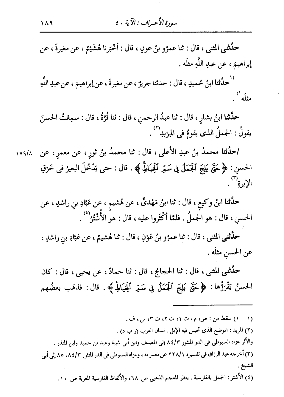 حَدَّثَنَا الْمُثَنَّى قَالَ: ثنا الْحَجَّاجُ قَالَ: ثنا حَمَّادٌ، عَنْ يَحْيَى قَالَ: كَانَ الْحَسَنُ يَقْرَؤُهَا: {§حَتَّى يَلِجَ الْجَمَلُ فِي سَمِّ الْخِيَاطِ} [الأعراف: 40] ، قَالَ: فَذَهَبَ بَعْضُهُمْ -[190]- يَسْتَفْهِمُهُ قَالَ: أَشْتَرُ أَشْتَرُ