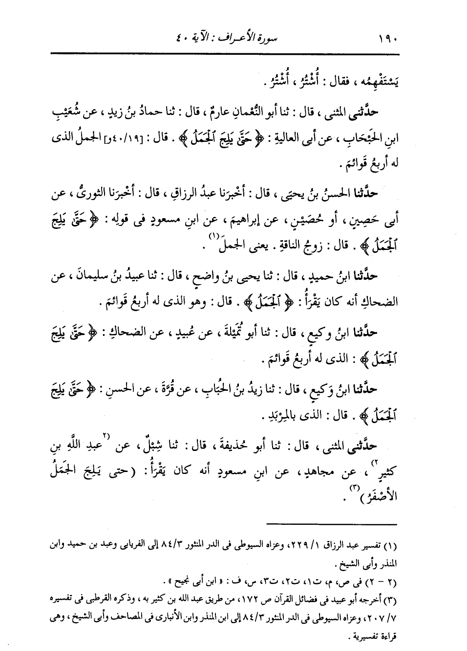 حَدَّثَنَا الْحَسَنُ بْنُ يَحْيَى قَالَ: أَخْبَرَنَا عَبْدُ الرَّزَّاقِ قَالَ: أَخْبَرَنَا الثَّوْرِيُّ، عَنْ أَبِي حُصَيْنٍ، أَوْ حُصَيْنٍ، عَنْ إِبْرَاهِيمَ، عَنِ ابْنِ مَسْعُودٍ فِي قَوْلِهِ: {§حَتَّى يَلِجَ الْجَمَلُ فِي سَمِّ الْخِيَاطِ} [الأعراف: 40] ، قَالَ: «زَوْجُ النَّاقَةِ، يَعْنِي الْجَمَلَ»