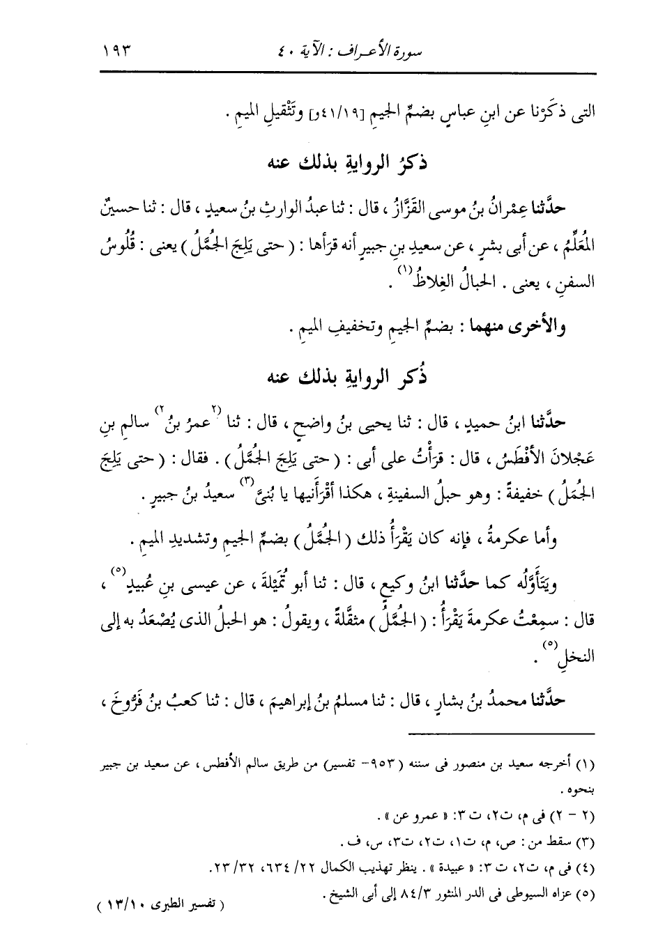 ذِكْرُ الرِّوَايَةِ بِذَلِكَ عَنْهُ حَدَّثَنَا عِمْرَانُ بْنُ مُوسَى الْقَزَّارُ، قَالَ: ثنا عَبْدُ الْوَارِثِ بْنُ سَعِيدٍ، قَالَ: ثنا حُسَيْنٌ الْمُعَلِّمُ، عَنْ أَبِي بِشْرٍ، عَنْ سَعِيدِ بْنِ جُبَيْرٍ، أَنَّهُ قَرَأَهَا: (حَتَّى يَلِجَ الْجُمَّلُ) ، يَعْنِي: «§قُلُوسَ السُّفُنِ، يَعْنِي الْحِبَالَ الْغِلَاظَ» وَالْأُخْرَى مِنْهُمَا بِضَمِّ الْجِيمِ وَتَخْفِيفِ الْمِيمِ