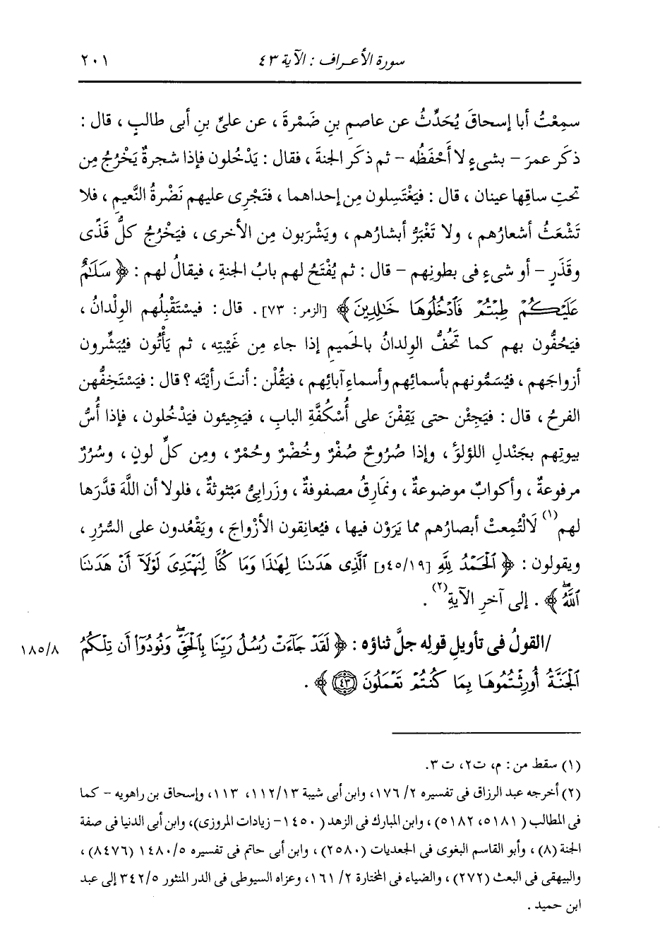 سَمِعْتُ أَبَا إِسْحَاقَ يُحَدِّثُ عَنْ عَاصِمِ بْنِ ضَمْرَةَ، عَنْ عَلِيٍّ، قَالَ: ذُكِرَ لِعُمَرَ شَيْءٌ لَا أَحْفَظُهُ، ثُمَّ ذُكِرَ الْجَنَّةُ، فَقَالَ: " §يَدْخُلُونَ فَإِذَا شَجَرَةٌ يَخْرُجُ مِنْ تَحْتِ سَاقِهَا عَيْنَانِ، قَالَ: فَيَغْتَسِلُونَ مِنْ إِحْدَاهُمَا، فَتَجْرِي عَلَيْهِمْ نَضْرَةُ النَّعِيمِ، فَلَا تَشْعَثُ أَشْعَارُهُمْ وَلَا تُغَبَّرُ أَبْشَارُهُمْ، وَيَشْرَبُونَ مِنَ الْأُخْرَى، فَيَخْرُجُ كُلُّ قَذًى وَقَذَرٍ، أَوْ شَيْءٍ فِي بُطُونِهِمْ. قَالَ: ثُمَّ يُفْتَحُ لَهُمْ بَابُ الْجَنَّةِ، فَيُقَالُ لَهُمْ: {سَلَامٌ عَلَيْكُمْ طِبْتُمْ فَادْخُلُوهَا خَالِدِينَ} [الزمر: 73] ، قَالَ: فَتَسْتَقْبِلُهُمُ الْوِلْدَانُ، فَيَحُفُّونَ بِهِمْ كَمَا تَحُفُّ الْوِلْدَانُ بِالْحَمِيمِ إِذَا جَاءَ مِنْ غَيْبَتِهِ. ثُمَّ يَأْتُونَ فَيُبَشِّرُونَ أَزْوَاجَهُمْ، فَيُسَمُّونَهُمْ بِأَسْمَائِهِمْ وَأَسْمَاءِ آبَائِهِمْ، فَيَقُلْنَ: أَنْتَ رَأَيْتَهُ؟ قَالَ: فَيَسْتَخِفُّهُنَّ الْفَرَحُ، قَالَ: فَيَجِئْنَ حَتَّى يَقِفْنَ عَلَى أُسْكُفَّةِ الْبَابِ. قَالَ: فَيَجِيئُونَ فَيَدْخُلُونَ، فَإِذَا أُسُّ بُيُوتِهِمْ بِجَنْدَلِ اللُّؤْلُؤِ، وَإِذَا صُرُوحٌ صُفْرٌ وَخُضْرٌ وَحُمْرٌ وَمِنْ كُلِّ لَوْنٍ، وَسُرُرٌ مَرْفُوعَةٌ، وَأَكْوَابٌ مَوْضُوعَةٌ، وَنَمَارِقُ مَصْفُوفَةٌ، وَزَرَابِيُّ مَبْثُوثَةٌ، فَلَوْلَا أَنَّ اللَّهَ قَدَّرَهَا لَالْتَمَعَتْ أَبْصَارُهُمْ مِمَّا يَرَوْنَ فِيهَا. فَيُعَانِقُونَ الْأَزْوَاجَ، وَيَقْعُدُونَ عَلَى السُّرُرِ وَيَقُولُونَ: {الْحَمْدُ لِلَّهِ الَّذِي هَدَانَا لِهَذَا وَمَا كُنَّا لِنَهْتَدِيَ لَوْلَا أَنْ هَدَانَا اللَّهُ لَقَدْ جَاءَتْ رُسُلُ رَبِّنَا بِالْحَقِّ} [الأعراف: 43] الْآيَةَ