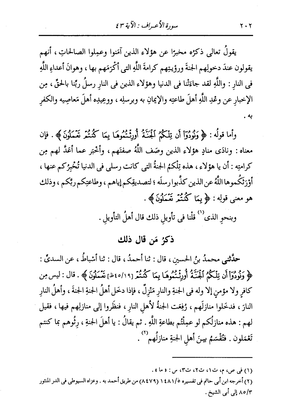 §وَأَمَّا قَوْلُهُ: {وَنُودُوا أَنْ تِلْكُمُ الْجَنَّةُ أُورِثْتُمُوهَا بِمَا كُنْتُمْ تَعْمَلُونَ} [الأعراف: 43] ، فَإِنَّ مَعْنَاهُ: وَنَادَى مُنَادٍ هَؤُلَاءِ الَّذِينَ وَصَفَ اللَّهُ صِفَتَهُمْ وَأَخْبَرَ عَمَّا أَعَدَّ لَهُمْ مِنْ كَرَامَتِهِ، أَنْ يَا هَؤُلَاءِ هَذِهِ تِلْكُمُ الْجَنَّةُ الَّتِي كَانَتْ رُسُلِي فِي الدُّنْيَا تُخْبِرُكُمْ عَنْهَا، أَوْرَثَكُمُوهَا اللَّهُ عَنِ الَّذِينَ كَذَّبُوا رُسُلَهُ، لِتَصْدِيقِكُمْ إِيَّاهُمْ، وَطَاعَتِكُمْ رَبَّكُمْ. وَذَلِكَ هُوَ مَعْنَى قَوْلِهِ: {بِمَا كُنْتُمْ تَعْمَلُونَ} [المائدة: 105] . وَبِنَحْوِ الَّذِي قُلْنَا فِي ذَلِكَ قَالَ أَهْلُ التَّأْوِيلِ