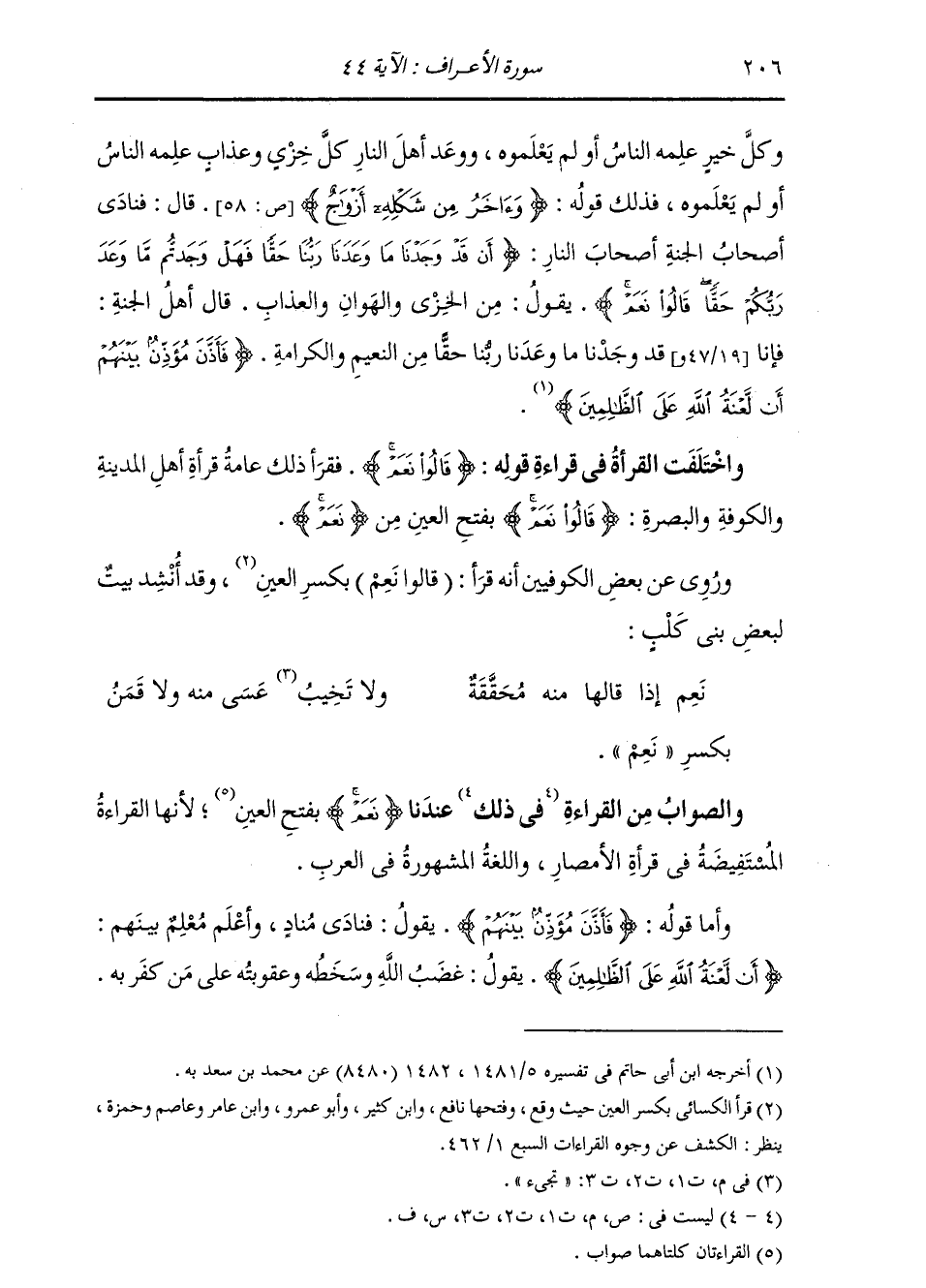 §وَأَمَّا قَوْلُهُ: {فَأَذَّنَ مُؤَذِّنٌ بَيْنَهُمْ} [الأعراف: 44] يَقُولُ: فَنَادَى مُنَادٍ، وَأَعْلَمَ مُعَلِّمٌ بَيْنَهُمْ، {أَنْ لَعْنَةَ اللَّهِ عَلَى الظَّالِمِينَ} [الأعراف: 44] ، يَقُولُ: غَضَبُ اللَّهِ وَسَخَطُهُ وَعُقُوبَتُهُ عَلَى مَنْ كَفَرَ بِهِ. -[207]- وَقَدْ بَيَّنَّا الْقَوْلَ فِي (أَنْ) إِذَا صَحِبَتْ مِنَ الْكَلَامِ مَا ضَارَعَ الْحِكَايَةَ وَلَيْسَ بِصَرِيحِ الْحِكَايَةِ، بِأَنَّهَا تُشَدِّدُهَا الْعَرَبُ أَحْيَانًا وَتُوقِعُ الْفِعْلَ عَلَيْهَا فَتَفْتَحُهَا، وَتُخَفِّفُهَا أَحْيَانًا وَتُعْمِلُ الْفِعْلَ فِيهَا فَتَنْصِبَهَا بِهِ وَتُبْطِلُ عَمَلَهَا عَنِ الِاسْمِ الَّذِي يَلِيهَا فِيمَا مَضَى، بِمَا أَغْنَى عَنْ إِعَادَتِهِ فِي هَذَا الْمَوْضِعِ. وَإِذْ كَانَ ذَلِكَ كَذَلِكَ، فَسَوَاءٌ شُدِّدَتْ (أَنْ) أَوْ خُفِّفَتْ فِي الْقِرَاءَةِ، إِذْ كَانَ مَعْنَى الْكَلَامِ بِأَيِّ ذَلِكَ قَرَأَ الْقَارِئُ وَاحِدًا، وَكَانَتَا قِرَاءَتَيْنِ مَشْهُورَتَيْنِ فِي قِرَاءَةِ الْأَمْصَارِ
